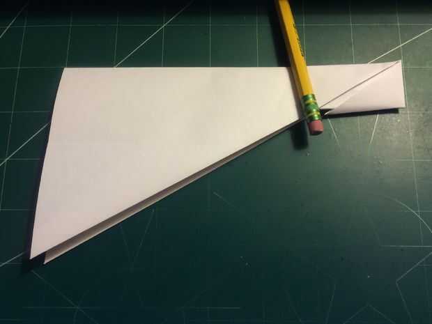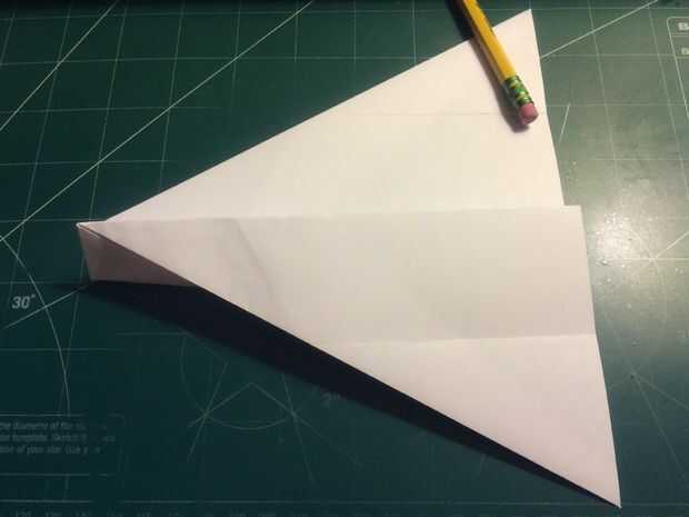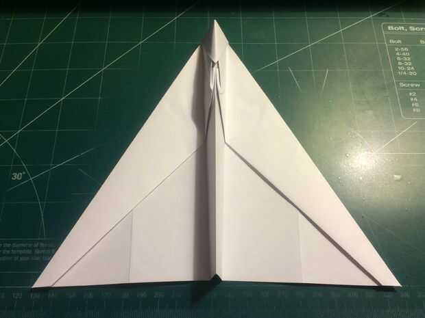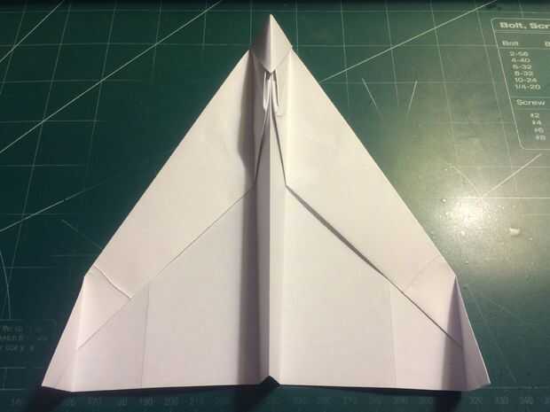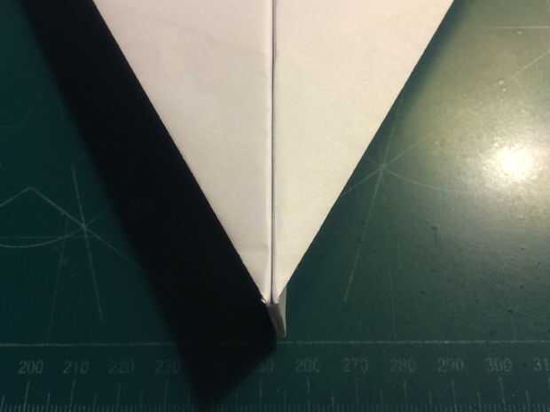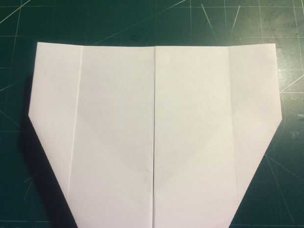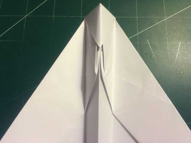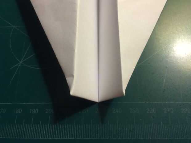 Doble las alas hacia abajo, alineando el pliegue de la raíz de ala con la parte superior de la tapa de la nariz y mantener los bordes de fuga paralelo con ellos mismos. Después de hacer esto, doblar los extremos del ala en el cuarto pliegues y arrugas para hacer las aletillas.
