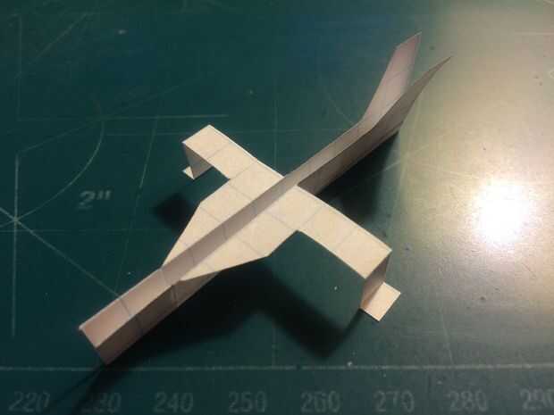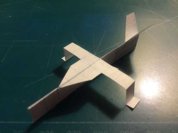 Cortar el fuselaje y doblar el contrapeso en el fuselaje. Doble hacia abajo los estabilizadores horizontales, tren de aterrizaje y mástiles. Una vez hecho esto, aplicar cinta de designado. Después de grabar todos señaló puntos, cortadas donde se muestra.