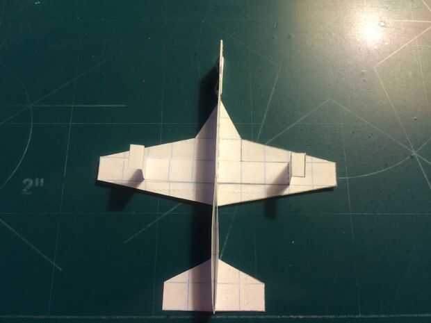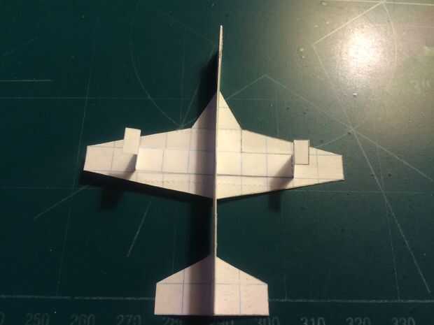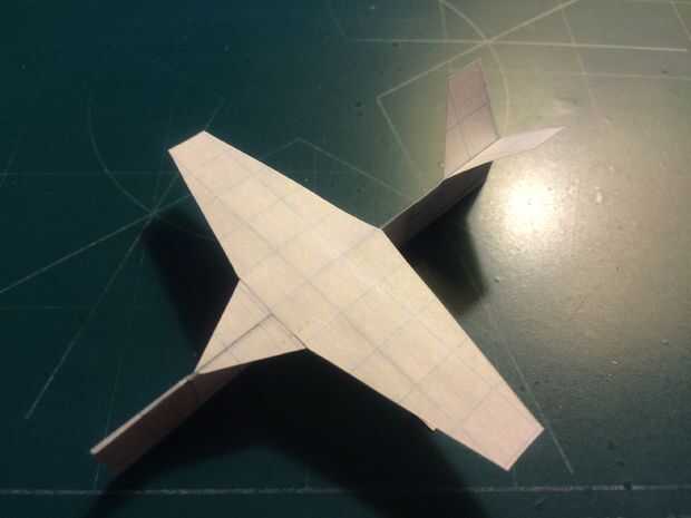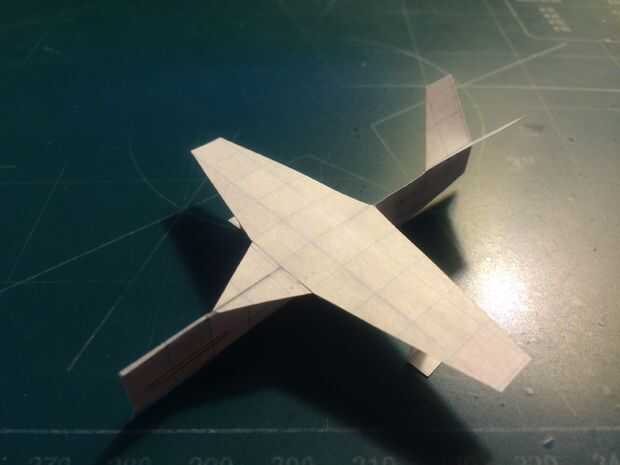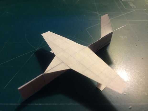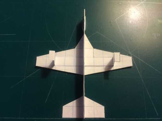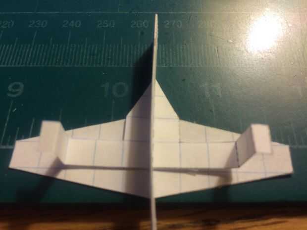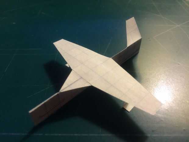 Corte y desplegar las alas de su SkyTraveler. Una vez hecho esto, alinee el fuselaje con las alas y asegure las alas a los largueros con la cinta. Aplicar cinta en el borde de ataque del ala en su intersección con el LERX y luego aplicar una grapa en la zona del contrapeso como se indica. Corte la parte del fuselaje debajo de la línea diagonal en la parte trasera. Esto completará tu avión.