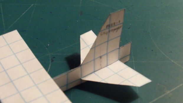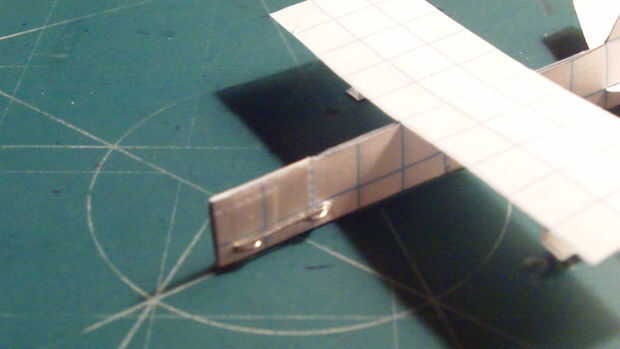Cut its wing out and unfold it. Su fuselaje invertido del tirón, alinear con el centro del ala y aplique la cinta a los largueros. Entonces Únete a ala y el fuselaje en los largueros. Entonces puso sus estabilizadores horizontales a través de su punto de anclaje determinado. Doble hacia arriba y luego aplicar la cinta en su parte inferior, colocar en el fuselaje. Una vez hecho esto, aplicar una grapa a cada lado del contrapeso.