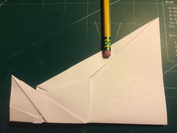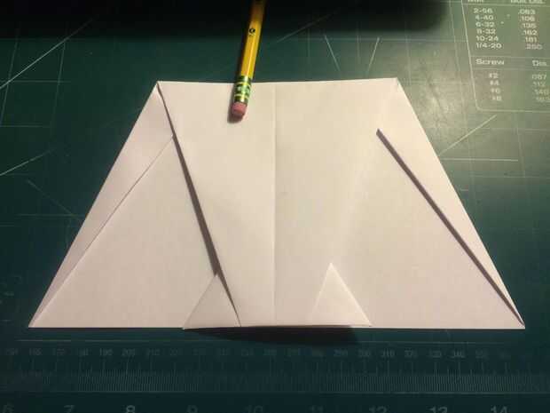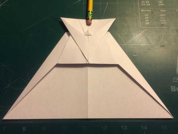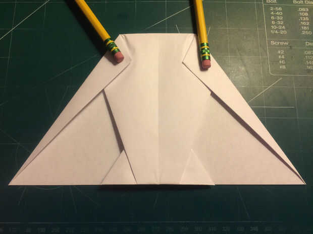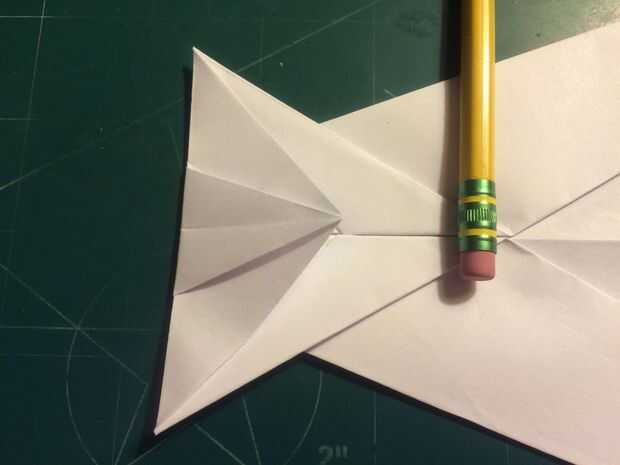 Después de esto, tire la punta ahora Roma del papel hasta el borde de salida del papel. Doble los bordes principales del ala hacia abajo a lo largo de los bordes de fuga de los pliegues de la superficie como se muestra. Una vez hecho esto, tire de los pliegues de la nariz hacia adelante hasta llegar a los pliegues de la superficie de sustentación puntos traseros nuevo y parada para hacer un pliegue; Luego doblar el avión a lo largo de su pliegue de centro.