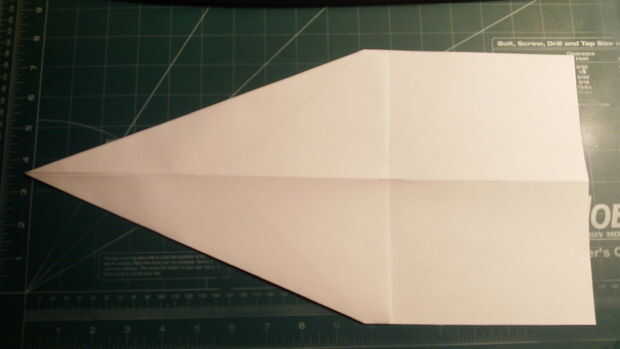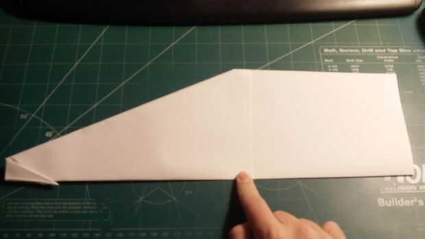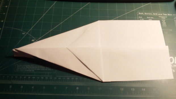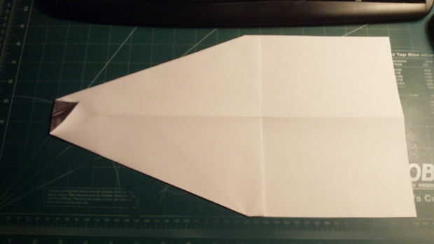 Difundir el papel abierto y luego tire la nariz hacia atrás 2 pulgadas desde el lado "sucio" al lado "limpio". Desde aquí, pliegue las alas hacia abajo de cerca de 1 pulgada por encima del pliegue del centro. Hacer los bordes de fuga de las alas paralelo parte trasera del fuselaje, por lo que no hay ningún ángulo de incidencia.