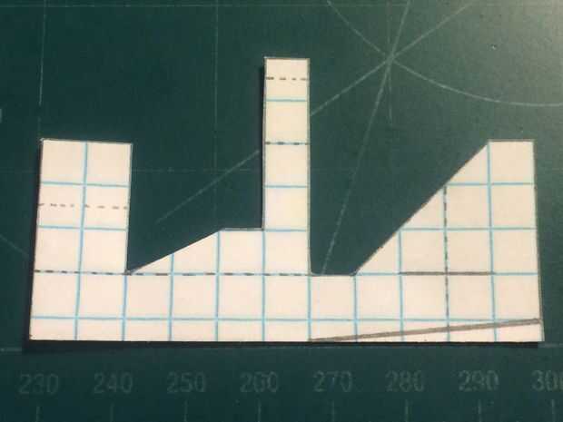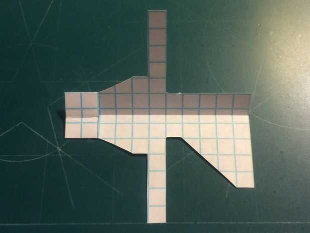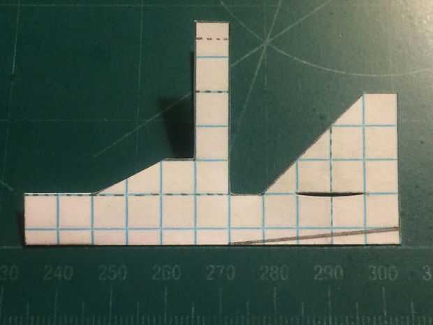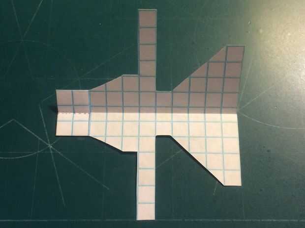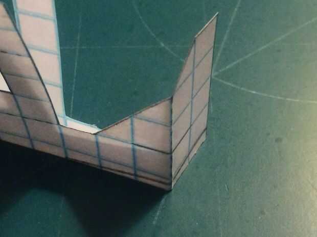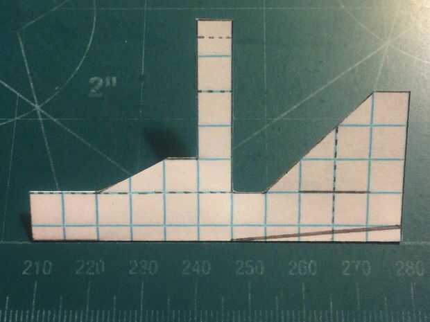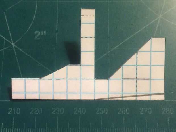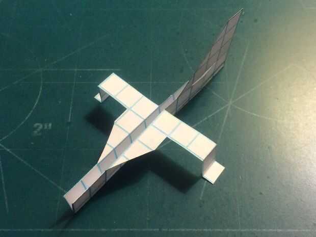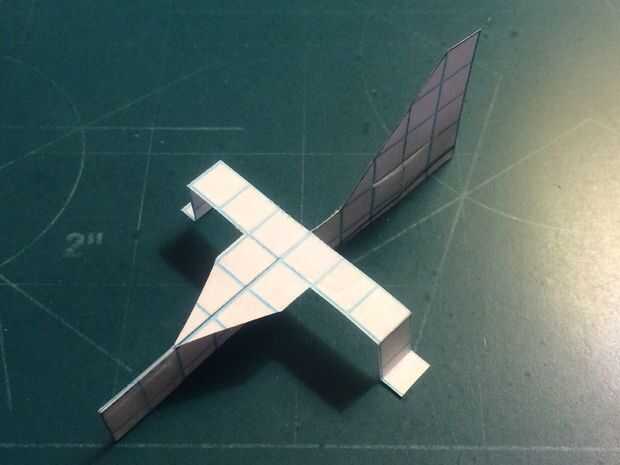 Cortar el fuselaje y doblar el contrapeso en el fuselaje. Corte el estabilizador vertical derecha. Doblar a lo largo de la línea punteada luego corte a lo largo de la línea y luego desdoblar. Doble hacia abajo las perchas y tren de aterrizaje. Una vez hecho esto, aplicar cinta de designado.