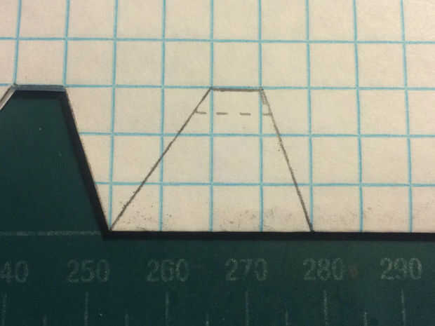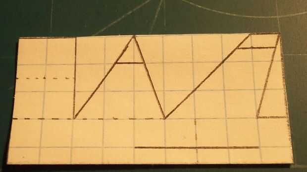 Después de que el fuselaje se hace, tomar otra hoja de papel que se dobla por la mitad a lo largo de las líneas de cajas. Marcar el ala como se muestra (eliminado de un barrido de borde de ataque de 2 cajas de acorde cada 3 cajas de luz, y un borde de salida de 1 caja de acorde eliminado cada 3 cajas de luz).