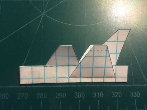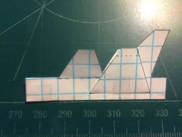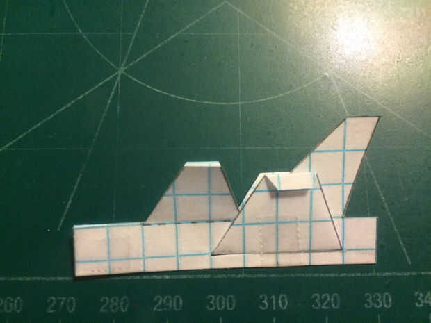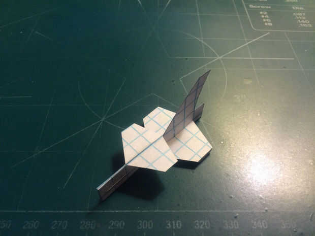 Cortar las alas y luego doble hacia abajo los extremos como se muestra. Tirar del ala a través de la fisura en el fuselaje, luego la cinta. Aplane las alas y canards para donde no tienen ninguna desviación anhedral. Aplicar una grapa en la zona del contrapeso. Esto completará tu StarAsteroid.