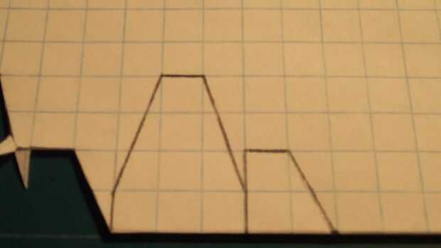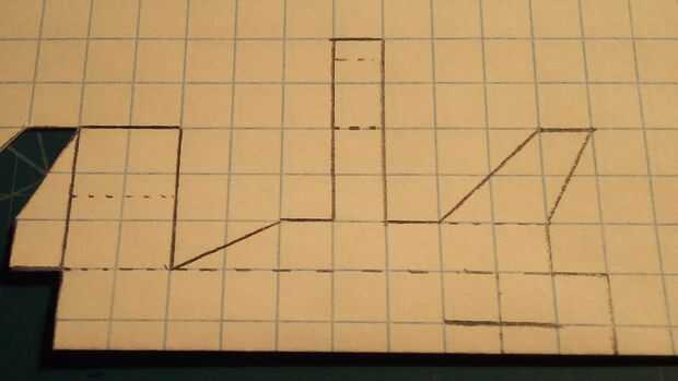 Después de que el fuselaje se hace, tomar otra hoja de papel que se dobla por la mitad a lo largo de las líneas de cajas. Marcar el ala como se muestra (1 caja de constante acorde a la raíz, con un área rectangular de 1 por 3 detrás de un área de 2 por 3 caja del ala con un borde de fuga cónica de 1 cajas de acorde y líderes eliminado cada 3 cajas de fuselaje). Luego cortar el ala. Medir 2 cajas a lo largo del pliegue, medir dos cajas hacia arriba de una marca y hacer otro punto. Luego trace una línea diagonal conectar esta nueva marca a la que más lejos. De la marca que acaba de realizar, medir una caja más lejos de la ahora conectado a la línea y haga una marca. Esboce una línea entre esta marca y la otra marca a lo largo del pliegue. Luego corte los estabilizadores horizontales.