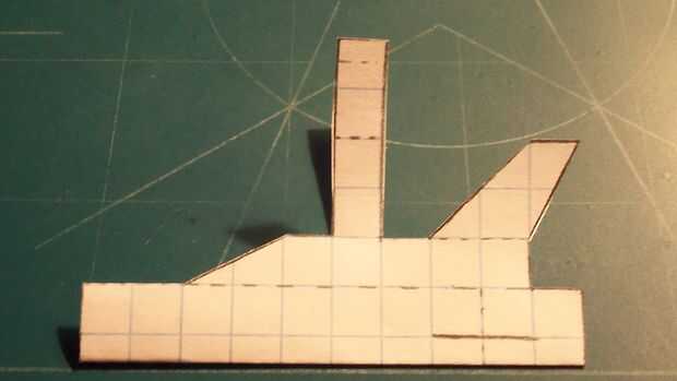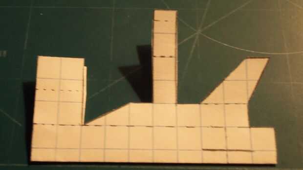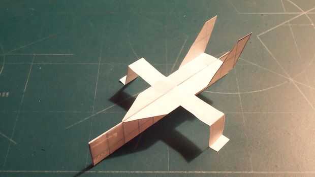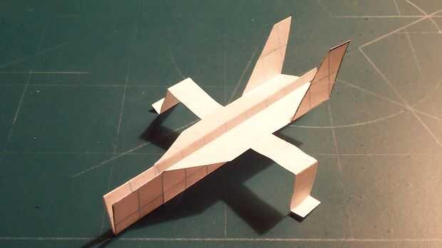 Corte hacia fuera su fuselaje y doblar sus contrapesos en su lugar. Una vez hecho esto, doblar a lo largo de la línea de puntos vertical y corte a lo largo de la línea horizontal continua. Una vez realizado el corte, suelte el pliegue. En este punto, se abaten las perchas y tren de aterrizaje y luego plegar las aletas verticales. Ahora la cinta de designado.