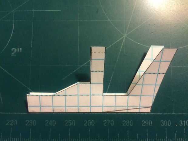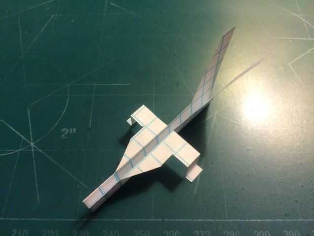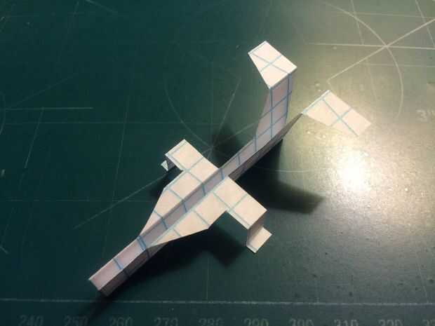 Cortar el fuselaje y doblar el contrapeso en el fuselaje. Doble hacia abajo los estabilizadores horizontales, tren de aterrizaje y mástiles. Una vez hecho esto, se despliegan los estabilizadores, patines y palos. Luego aplique cinta de designado.