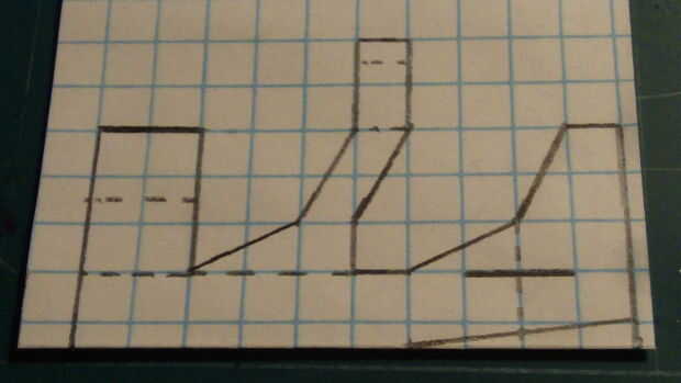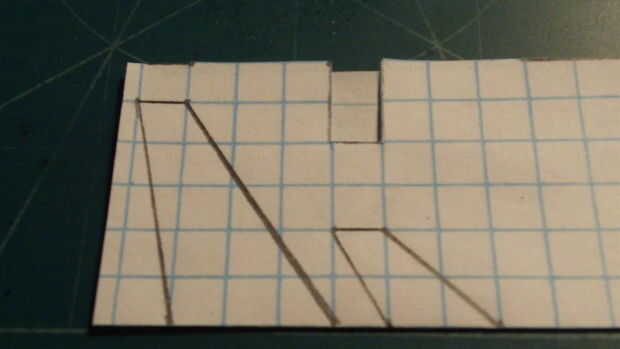 Después de que el fuselaje se hace, tomar otra hoja de papel que se dobla por la mitad a lo largo de las líneas de cajas. Marcar el ala como se muestra (3 cajas de acorde a la raíz, por 5 cajas de ancho, con un movimiento de vanguardia de 3 cajas de acorde eliminaron cada 5 cajas de la raíz del fuselaje y un borde posterior barrido de 1 caja de acorde cada 5 cajas de la raíz). Luego cortar el ala. Medir 2 cajas a lo largo del pliegue, medir dos cajas hacia arriba de una marca y hacer otro punto. Luego trace una línea diagonal conectar esta nueva marca a la que más lejos. De la marca que acaba de realizar, medir una caja más lejos de la ahora conectado a la línea y haga una marca. Esboce una línea entre esta marca y la otra marca a lo largo del pliegue. Luego corte los estabilizadores horizontales.