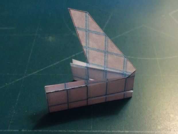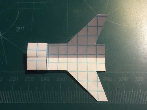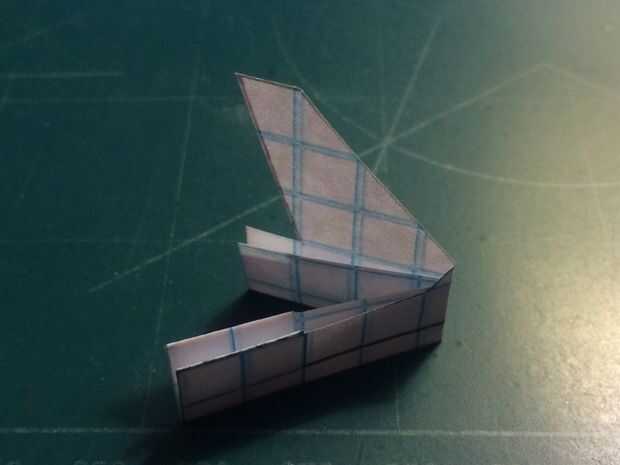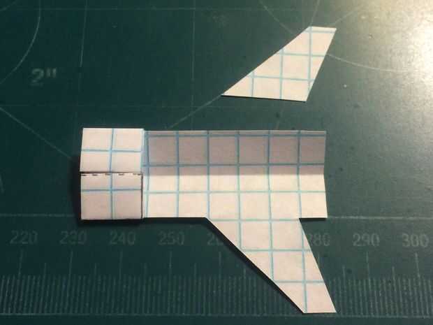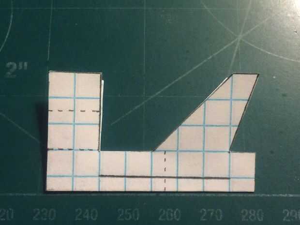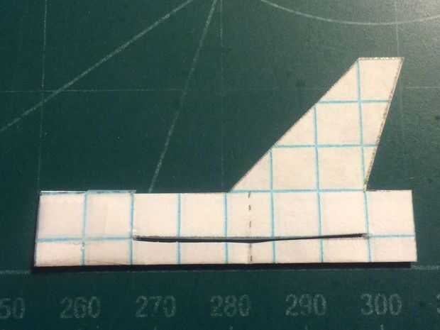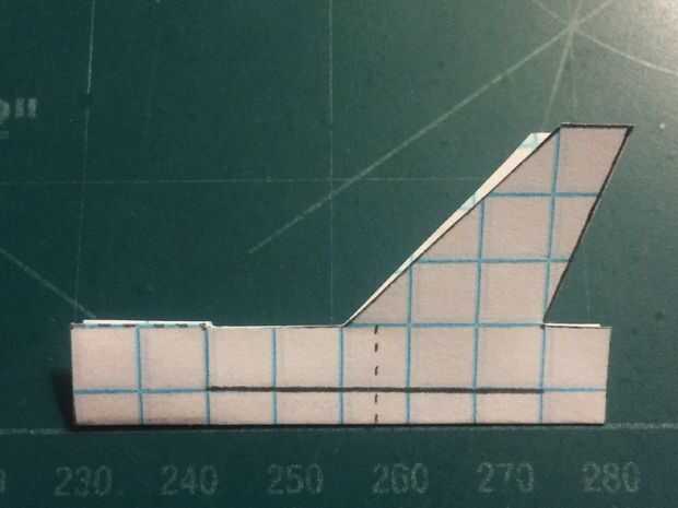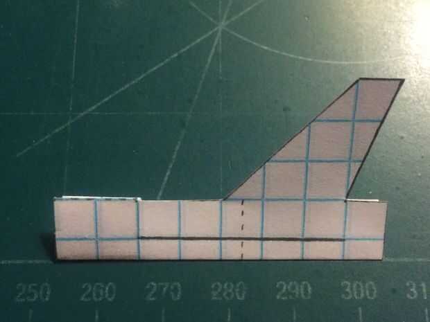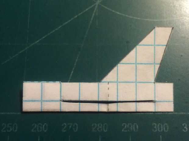 Cortar el fuselaje y doblar sus contrapesos en su lugar. Corte la aleta vertical extra. Una vez hecho esto, doblar a lo largo de la línea de puntos vertical y corte a lo largo de la línea horizontal continua. Una vez realizado el corte, deshacer el doblez y cinta de designado.