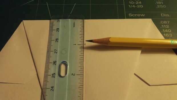Tire los pliegues diagonales de los dobleces de esquina en el pliegue del centro y hacer pliegues a cada lado. Luego retire la punta de la nariz hasta la punta de la cola y el pliegue. Mide 1 pulgada de este pliegue y haga una marca, luego doblar hacia delante en esta marca y el pliegue como se indica. Desplegar este pliegue de la nariz para doblar las esquinas bajo el triángulo de la nariz, y luego restaurar el pliegue y así asegurar los pliegues doblados. Medir 3,375 pulgadas desde la punta de la nariz y hacer una marca, luego doblar la punta de la nariz a este punto.