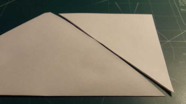 Doble su avión la mitad, luego baje las esquinas de la parte de atrás como lo hizo originalmente en la parte delantera. A continuación se despliegan. Luego corte a lo largo de los pliegues de estos dobleces de esquina hechos. Deben ser iguales uno con el otro. Entonces pueden reciclar los desechos de que se cortaron.