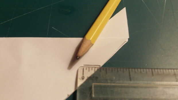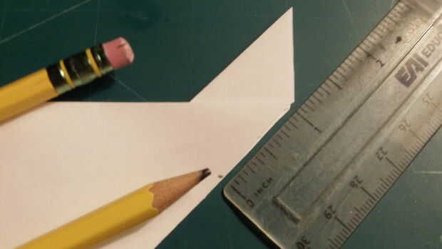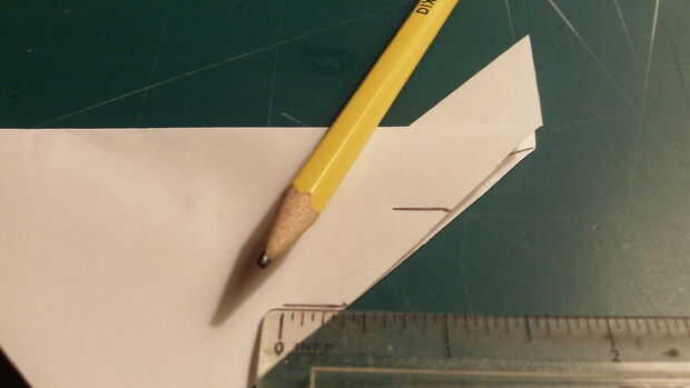 Doblar sus alas de aviones hacia abajo y medida 1 pulgada hacia el exterior del fuselaje a lo largo del borde posterior. Hacer una marca y la medida pulgadas otro más y hacer otra marca. De cada una de estas marcas, medir hacia adentro mientras que es paralelo al fuselaje 3/8 de pulgada. Luego corte a lo largo de estas líneas. Una vez cortadas, doblarlas tanto arriba y doble como se muestra.