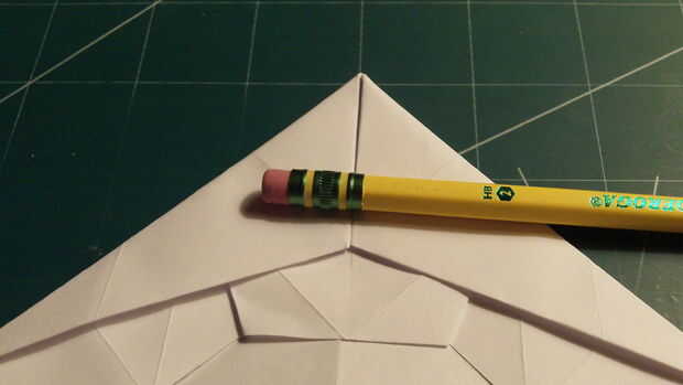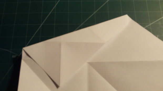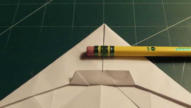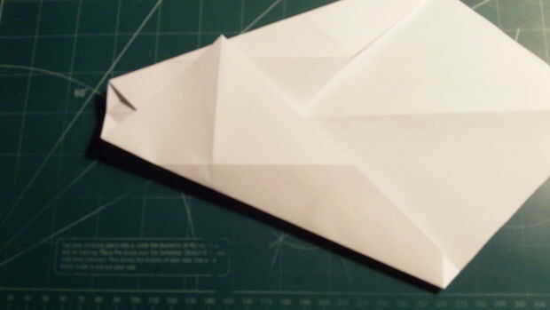 Doblar las esquinas en los pliegues de la Cruz ("X") plegable. Luego doblarlas hacia abajo a lo largo del pliegue de la mutuo que confluye en el centro. Doble el borde romo del frente en hacia el centro como se muestra. Luego tire de la lengüeta trapezoidal pequeña de papel hacia adelante y asegure los pliegues del borde de ataque hacia abajo.