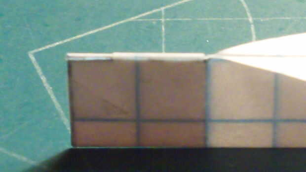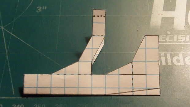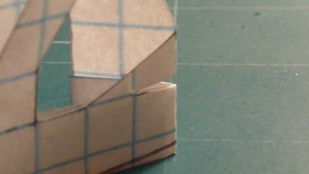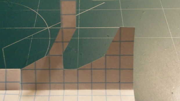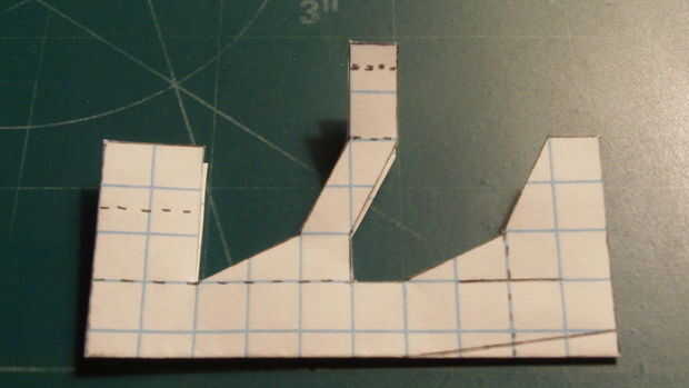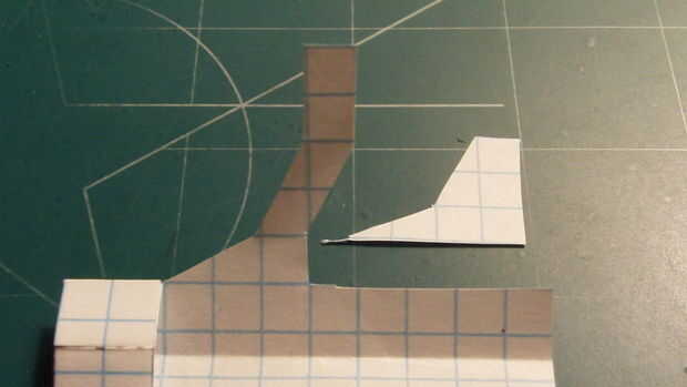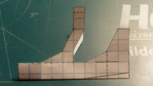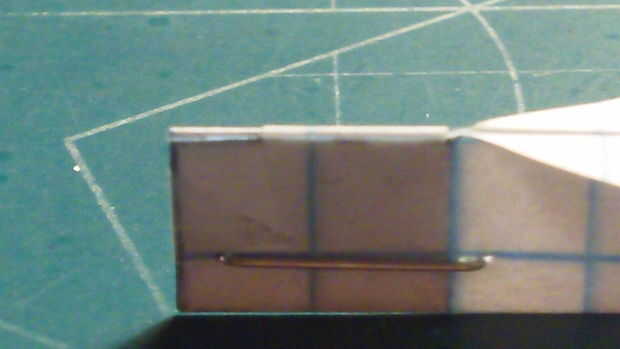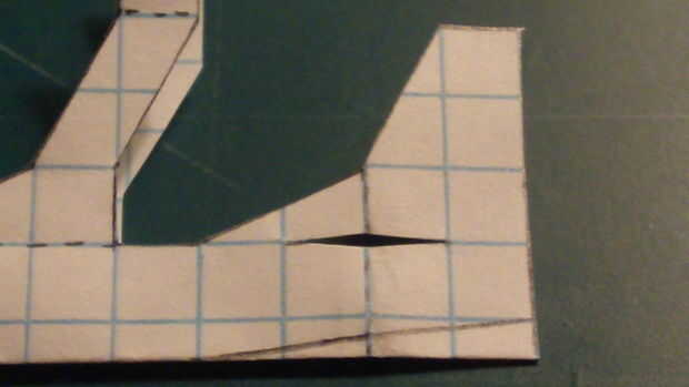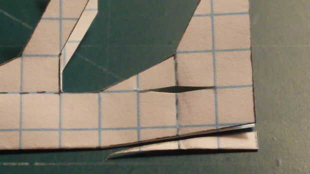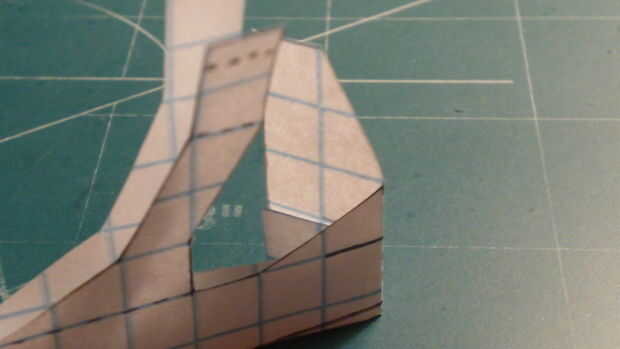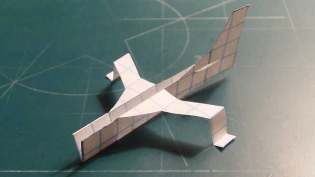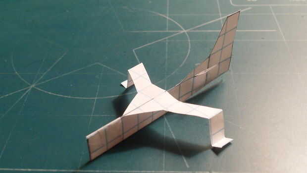 Cortar el fuselaje y pliegue el contrapeso en sí mismo como se muestra. Luego desplegar el fuselaje y corte el estabilizador vertical derecha. Entonces restaurar el pliegue. Doblar el fuselaje hacia adelante en la línea vertical en el estabilizador vertical. Una vez haya hecho el corte a lo largo de la línea marcada, se despliegan. Corte ahora a lo largo de la línea diagonal en la quilla de la armadura de avión. Una vez hecho esto, se abaten las perchas y patines. Luego aplique cinta de designado. Aplicar una grapa en la zona del contrapeso.