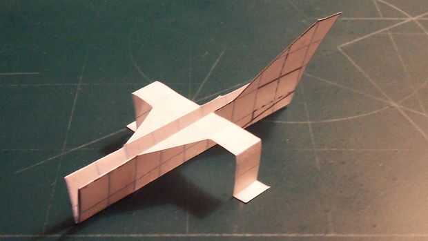 Comenzar a construir el fuselaje doblando los contrapesos en el fuselaje. Una vez han sido doblados, revelan el fuselaje y cortar el estabilizador vertical derecha. Una vez hecho esto, restaurar el pliegue. Después de hacer esto, doble estabilizador vertical hacia adelante a lo largo de la línea de puntos que indica el centro de lo que será ser la ranura de los estabilizadores horizontales, luego se corta. Después de este corte, corte la parte inferior del fuselaje debajo de la línea diagonal de la parte trasera del fuselaje. Después de este corte, corte a lo largo de la línea vertical de las aletas ventrales. Aplique cinta de designado y las aletas ventrales del doblez como se muestra.