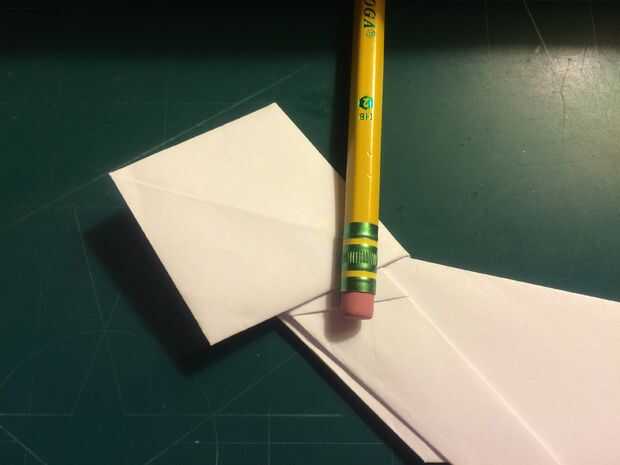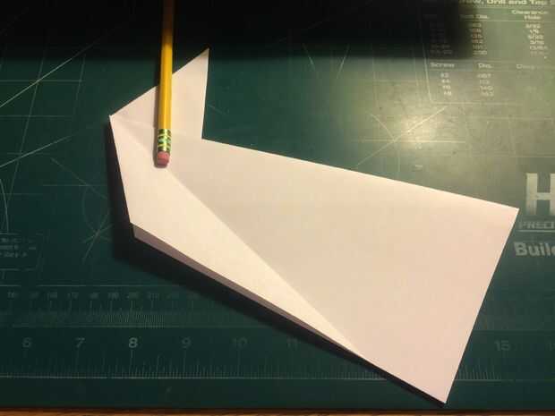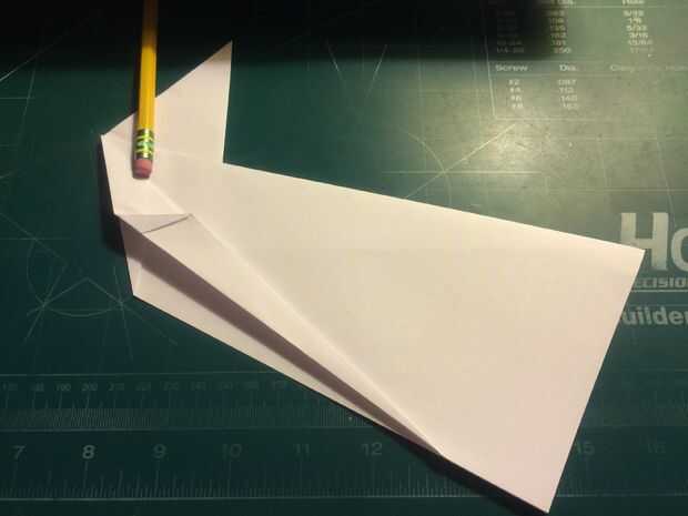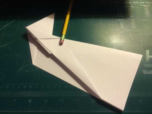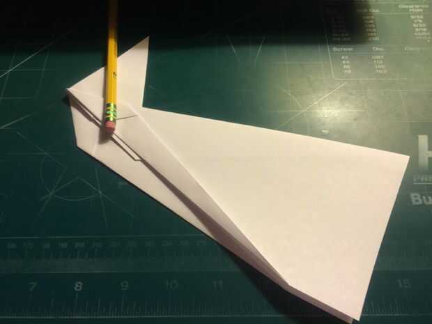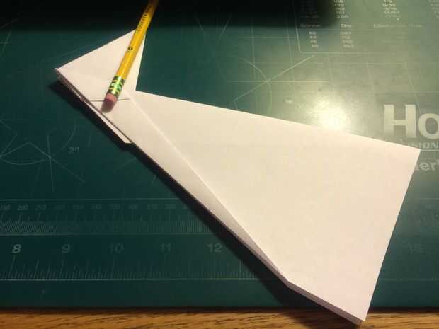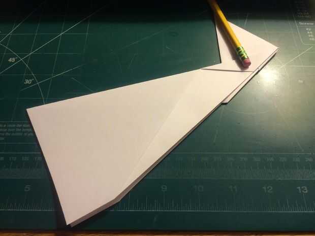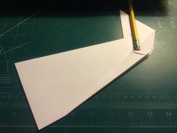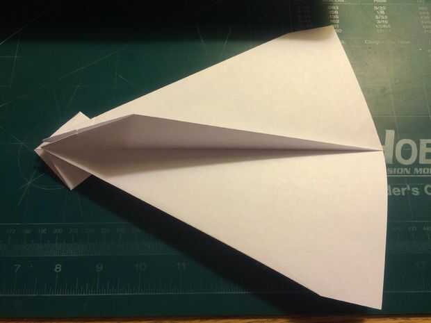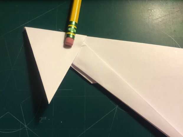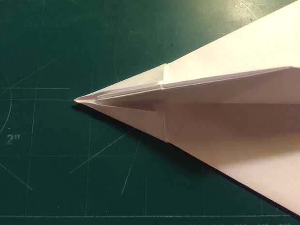 Tire de los bordes delanteros de las alas hacia atrás, hacia las raíces del ala y las arrugas. Una vez hecho esto en ambos lados, revelan los dobleces que ha hecho y tire sus bordes exteriores a los pliegues como se muestra. Una vez terminado, restaurar los dobleces originales. Después de terminar con las superficies de sustentación, baje el pliegue triangular de la nariz sobre las raíces del ala como se muestra. Alinee el borde posterior de la tapa de la nariz con la raíz del ala y doble hacia abajo como se muestra. Voltee el aeroplano y tire de los bordes que sobresalen de la tapa de la nariz triangular alrededor de los bordes delanteros de las alas.