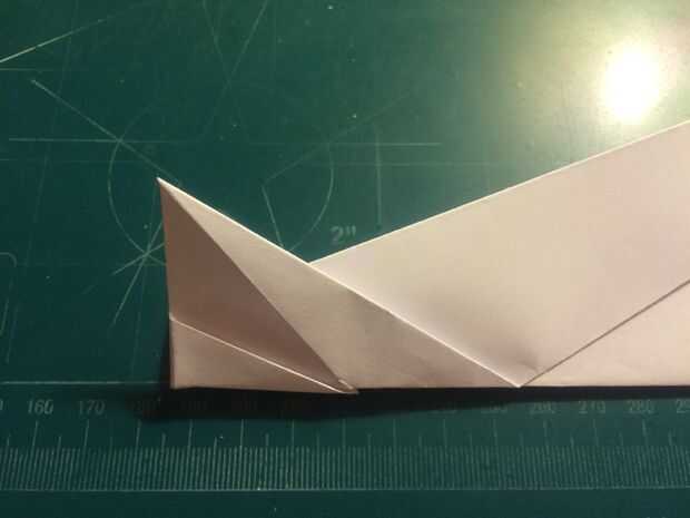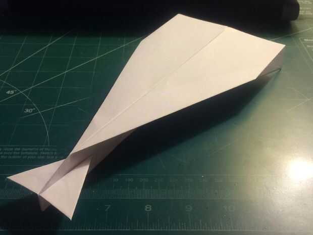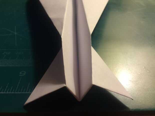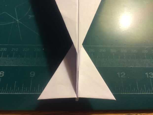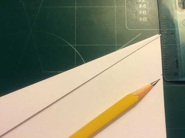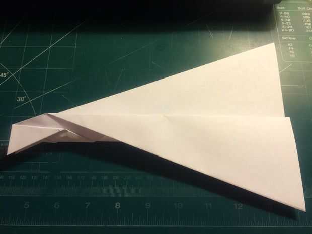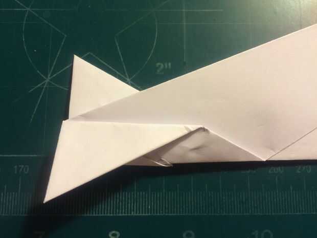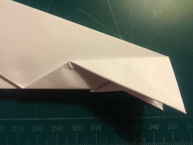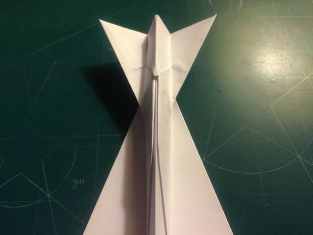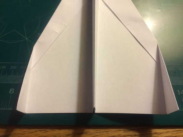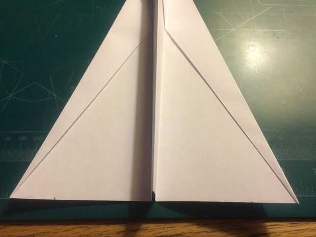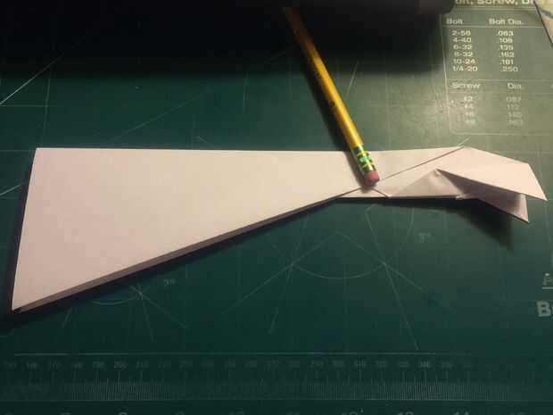 Doble hacia abajo las canards mientras mantienen sus bordes principales alineados con la nariz para mantener un ángulo de incidencia de cero grados. En el borde de fuga, hacer marcas de 1 pulgada desde el pliegue de centro y 1 pulgadas de los extremos del ala a lo largo del borde posterior del ala. Después de esto, plegar las alas en la marca que hiciste anteriormente. Alinee los bordes de fuga de las alas con eso del fuselaje para mantener el ángulo de incidencia a cero grados. Después de que esto termine, doble los extremos hacia abajo en las marcas realizadas anteriormente.
