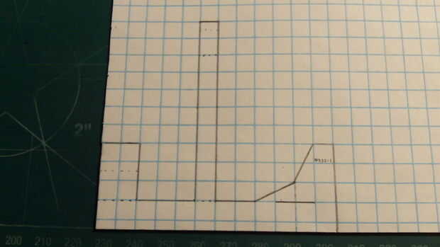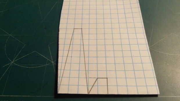 En primer lugar, comenzar por plegamiento eres tu papel milimetrado en la mitad (excepto tres cajas en el lado perforado). Una vez que el papel ha sido doblado adecuadamente, haga dos marcas--15 cajas full apart. Use una regla para hacer una línea recta con una longitud de 12 cajas directamente a 1 fila de cajas de las dos marcas que acaba de hacer. Luego realizar el timón, largueros y contrapeso como se indica. Siga las marcas de la fotografía. 3 caja detrás el contrapeso, marca a los largueros, 10 cajas de progreso fuera del fuselaje. Medio una caja en desde la punta de los mástiles, hacer las líneas punteadas. cajas de 1,5 más hacia adentro, hacen otra línea de puntos. Una vez hecho esto, marcar el timón como se muestra. Entonces, bajo el timón de dirección marca una línea que se extiende 2 cajas. 1 caja tras el inicio de esta línea, hacer una línea de puntos vertical. Una vez que todo está marcado hacia fuera, cortar el fuselaje.