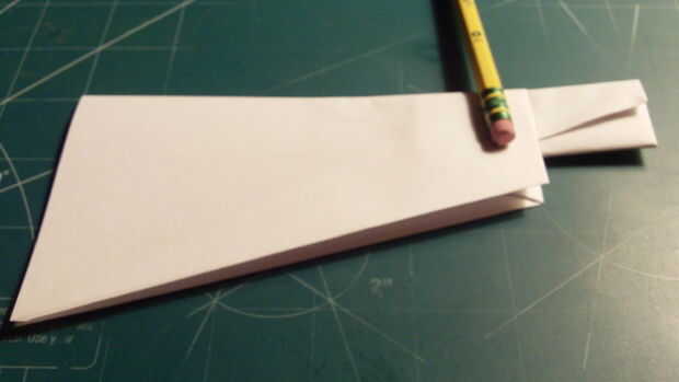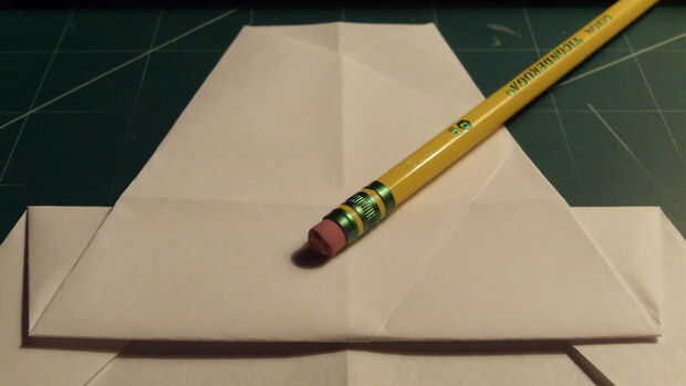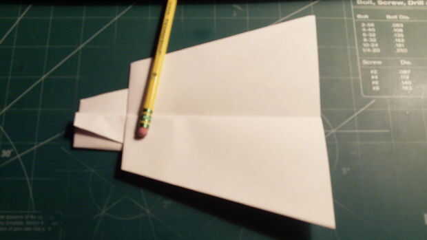 Doble la nariz hacia adelante como se muestra el pliegue que hizo en el paso anterior, luego pliegue demasiado este nuevo redil. Una vez hecho esto, tire del papel más adelante y quedar el pliegue primer con el segundo. Una vez hecho esto, doblar la punta de la nariz hasta el primer pliegue. Dobla el papel por la mitad a lo largo de su centro y su regla para hacer una marca de 1 pulgada por encima de la línea central en el borde de fuga. Doble las alas hacia abajo y arruga para hacer en este momento las raíces del ala. Asegúrese de alinear los bordes de fuga de las alas con el fuselage mantenga un ángulo de incidencia de 0 grados.