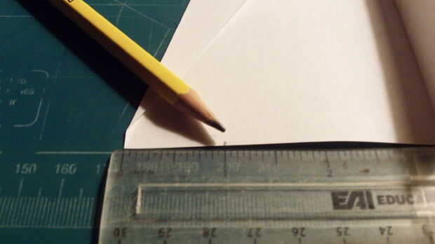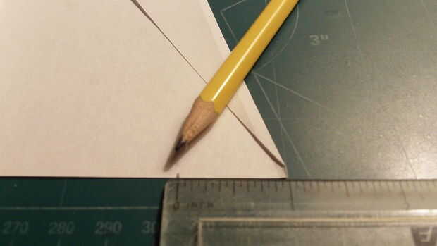 Unfold the two wings. Luego use su lápiz y regla para encontrar y marcar 1 pulgada en de los extremos del ala en cada lado. A continuación tire de los extremos hacia adentro y alinee los bordes de fuga con los del ala. Luego realizar pliegues en las marcas. Una vez que se doblan dos aletillas, despliegan y voltee la armadura de avión. Pegue su StratoEagle en su frente, los bordes delanteros, detrás y a través de su raíz cerca del borde posterior del ala.