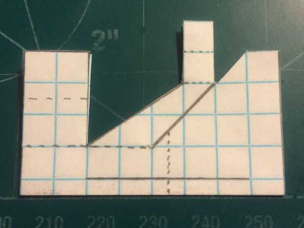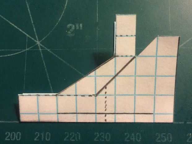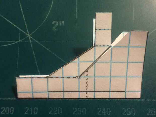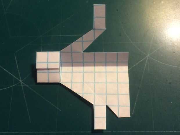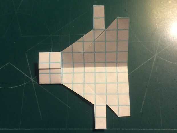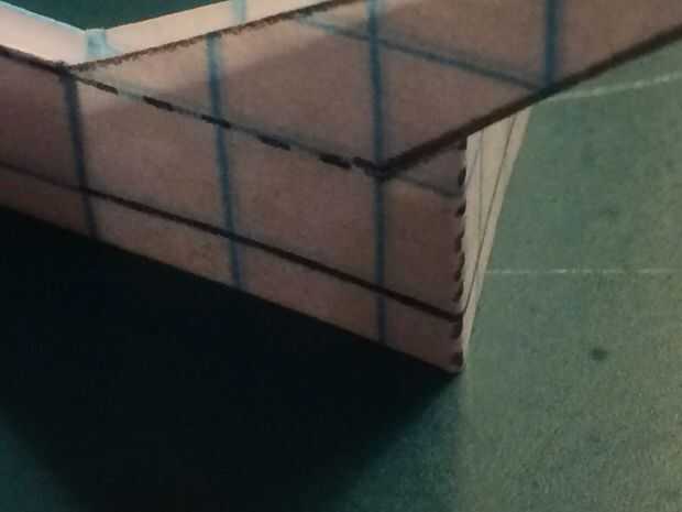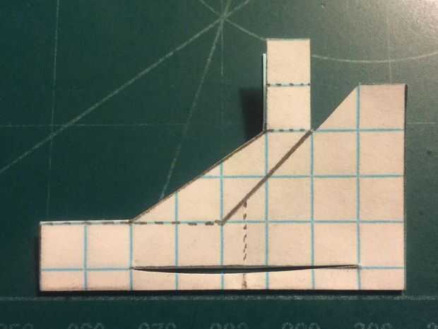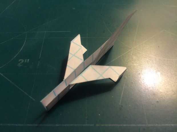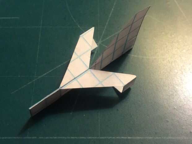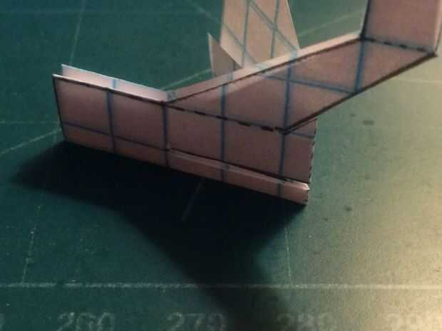 Cortar el fuselaje y doblar sus contrapesos en su lugar. Cortar la aleta vertical extra (pero no no dañar los canards en hacerlo). Corte a lo largo de la línea continua que representa la vanguardia de la aleta vertical y los bordes de fuga de los estabilizadores. Una vez hecho esto, doblar a lo largo de la línea de puntos vertical y corte a lo largo de la línea horizontal continua. Una vez que la corte se ha hecho, deshacer el doblez, baje los estabilizadores y cinta de designado.