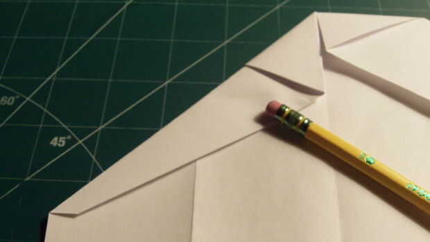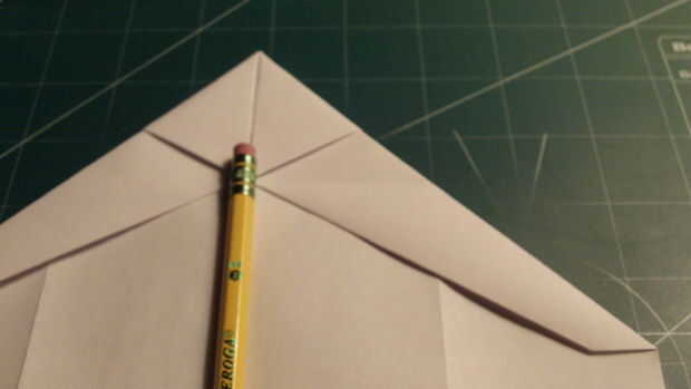 De su posición anterior, se voltea el papel para que su lado "limpio" quede mirando hacia arriba. Luego retire la punta de la nariz hasta el punto en el pliegue de centro que es igual a distancia a los extremos del barrido de vanguardia. La tapa el papel encima y tire la sección contundente del papel hacia el centro.