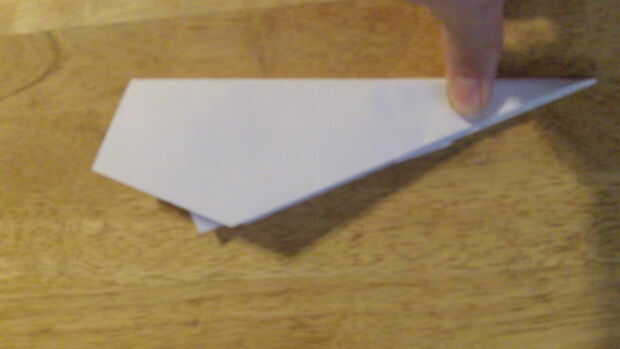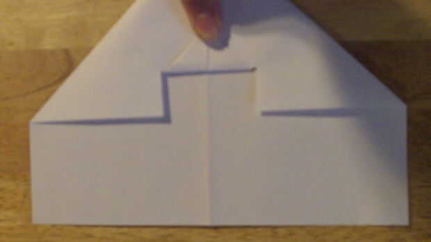 Tire el pequeño triángulo hacia arriba a través del orificio de 2 por 1 pulgadas y doble hacia abajo. Luego doblar el plano por la mitad y las alas hacia el centro (abajo) del fuselaje.