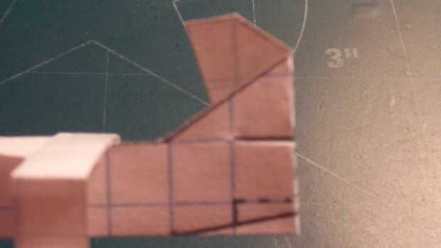 Comenzar a construir el fuselaje doblando los contrapesos en el fuselaje. Una vez han sido doblados, revelan el fuselaje y cortar el estabilizador vertical derecha. Una vez hecho esto, restaurar el pliegue. Después de hacer esto, doble estabilizador vertical hacia adelante a lo largo de la línea de puntos que indica el centro de lo que será ser la ranura de los estabilizadores horizontales, luego se corta. Después de este corte, corte la parte inferior del fuselaje debajo de la línea diagonal de la parte trasera del fuselaje. Después de este corte, corte a lo largo de la línea vertical de las aletas ventrales. Aplique cinta de designado y las aletas ventrales del doblez como se muestra.