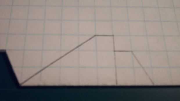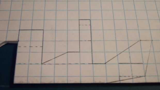 Doble el papel por la mitad para que la mitad de una caja está en la línea de pliegue. Haga una marca, luego mida 6 cajas atrás y hacer otra marca. De esta segunda marca, mida la mitad una caja arriba, tres cajas detrás. De esta tercera marca, medir y marcar 3 cajas más hacia arriba 1 hacia atrás. Una caja delante y debajo de la marca pasada; luego realizar una línea de dos cajas de estiramientos hacia adelante de esta quinta marca. Más allá de esto, las fotos explican las otras marcas con menos confusión--mejor que puedo explicar con palabras. Una vez que todo está marcado hacia fuera, cortar el fuselaje.