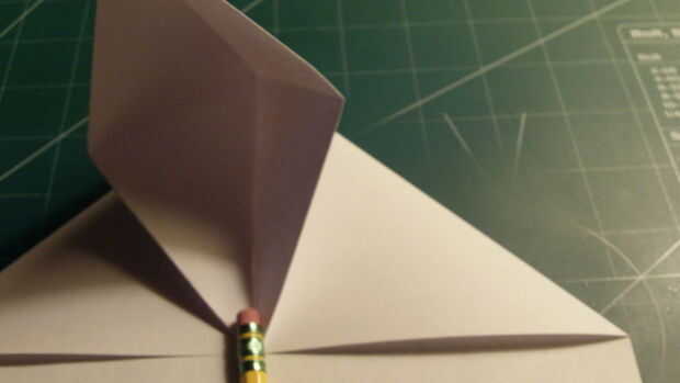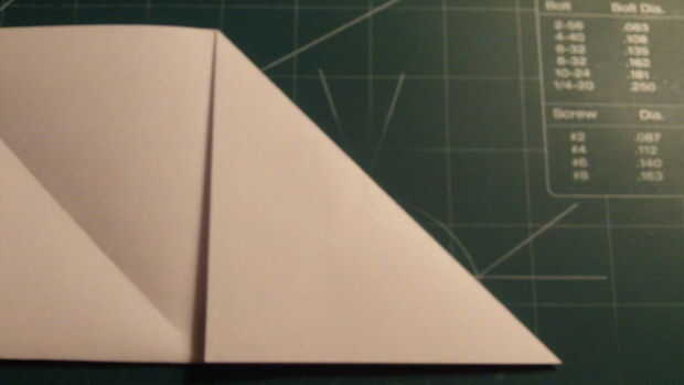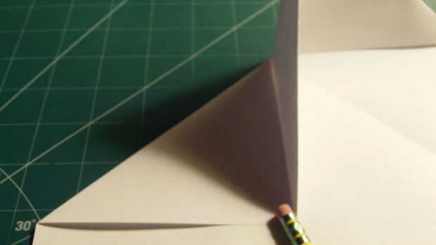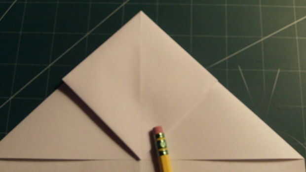 Doblar el papel por la mitad a lo largo de su longitud. Luego plegar las esquinas del lado más cercano al doble de anchura a cada lado. Luego doblar y meter el papel debajo de sí mismo. Luego aplanar la sección diamante de papel encima del resto del papel.