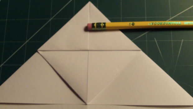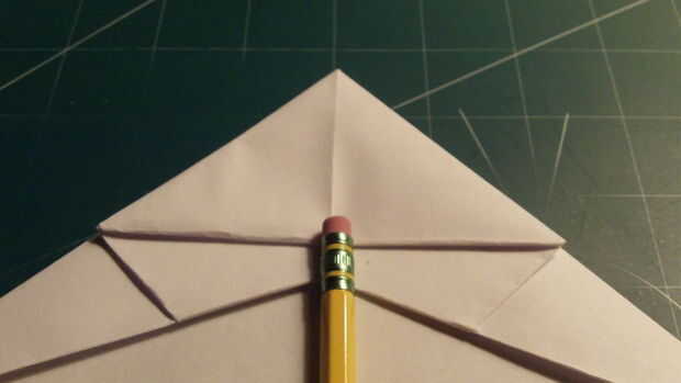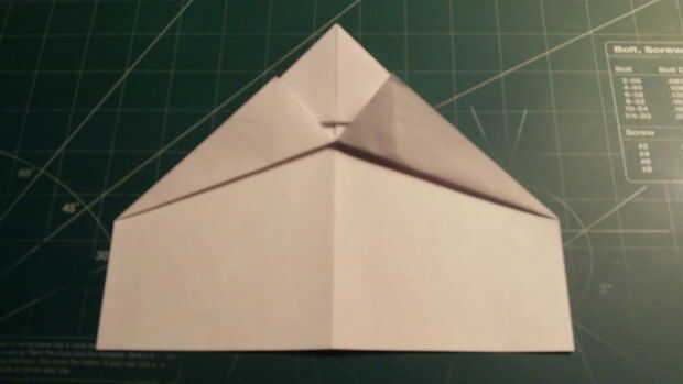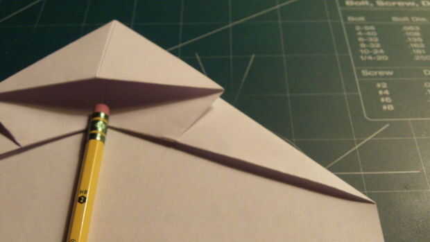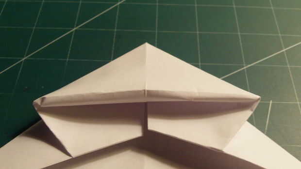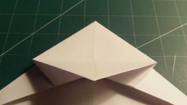 Tire de la parte posterior del diamante ventral hacia adelante a su contrario. Luego, doblar los perfiles para que los bordes traseros toquen los bordes principales del ala. Hacer un pliegue en este punto invertir y meter este papel debajo de sí mismo como se muestra. Después de que los perfiles estén metidos debajo de sí mismos, tire el diamante la mitad atrás y meter debajo de la parte que había sido doblado encima. Luego pliega el papel por la mitad, la parte sin los perfiles hacia afuera.