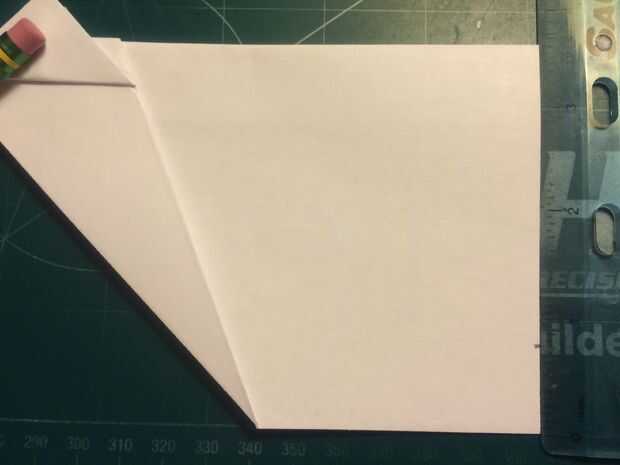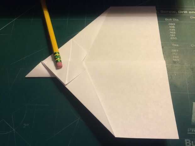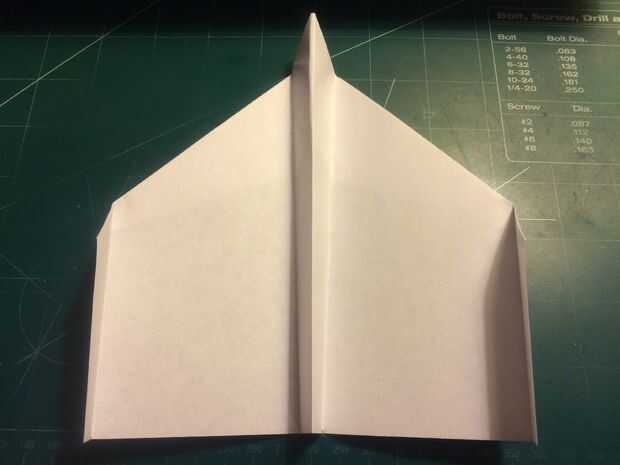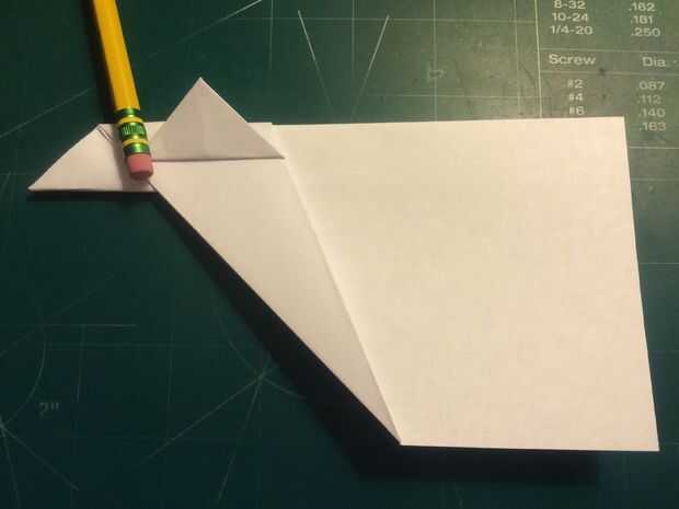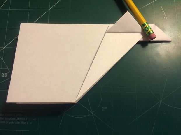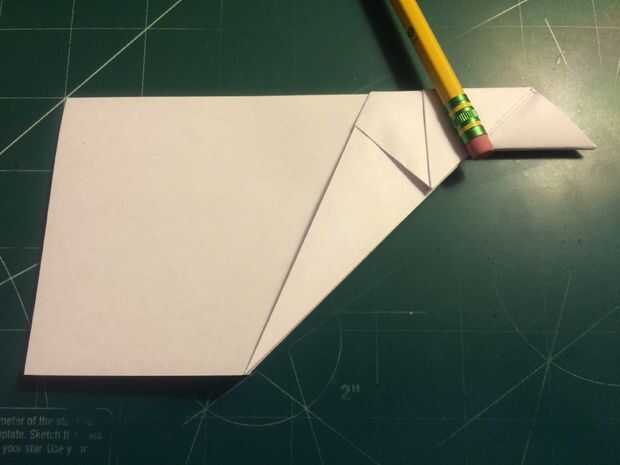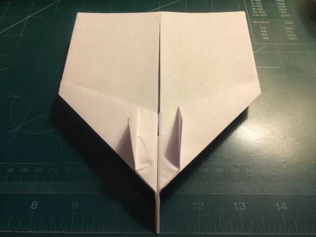 Mide 0,75 pulgadas por encima del pliegue del centro a lo largo del borde posterior y haga una marca. Plegar el ala en esta marca y alineando el borde de fuga del ala con el fuselaje. Repita en el otro lado. Doble estabilizador encima de paralelo con el doblez del ala, alineando con el doblez vertical del paso anterior como se muestra. Repita en el otro lado. Mide 0,75 pulgadas desde el extremo del ala y haga una marca en cada ala. En estas marcas, baje las aletillas y mantenerlos paralelos en el fuselaje, alineando sus bordes de fuga con las de las alas. El avión en la nariz, frente a cada uno de los estabilizadores, la parte trasera y sobre la raíz del ala cerca del borde posterior de la cinta. Esto completará tu StratoShark.