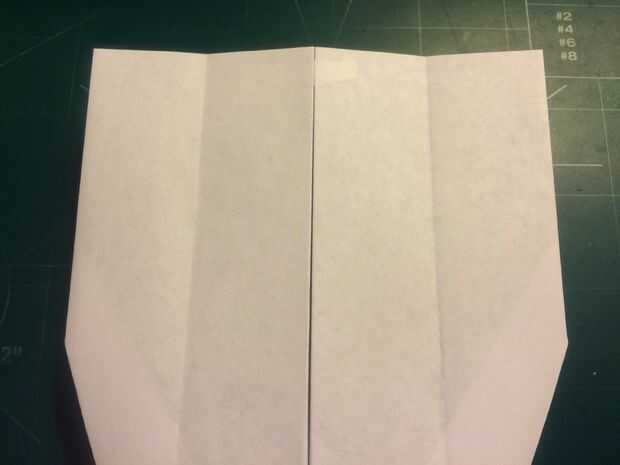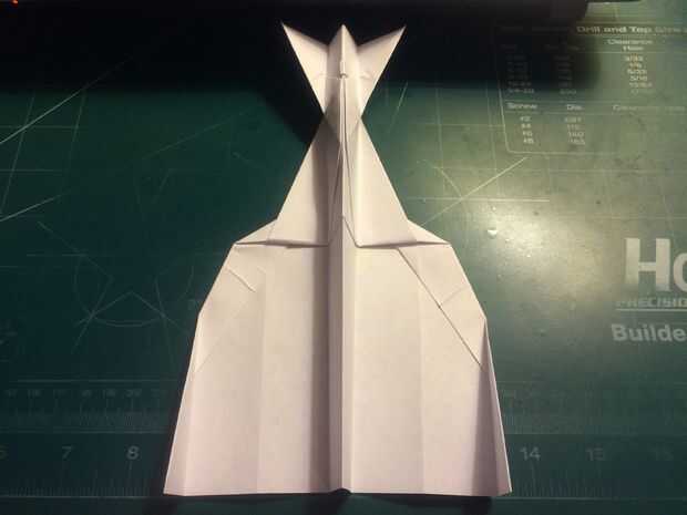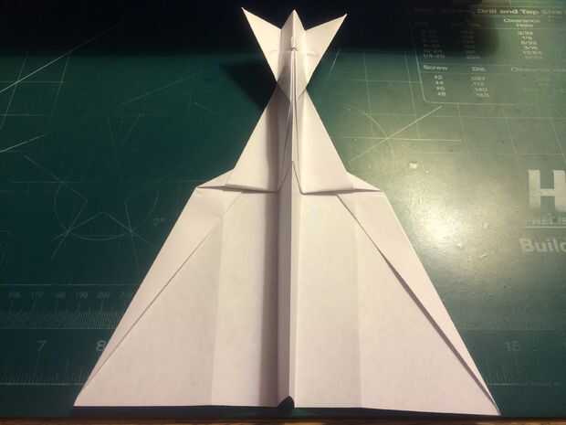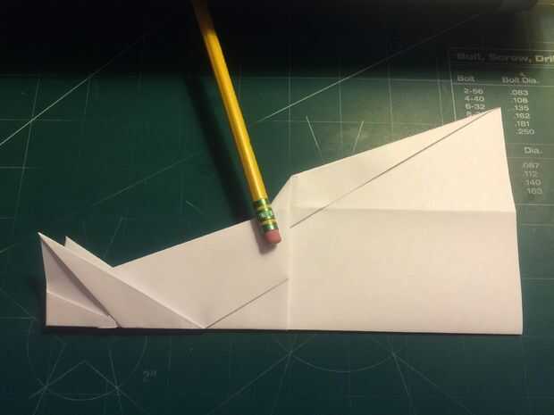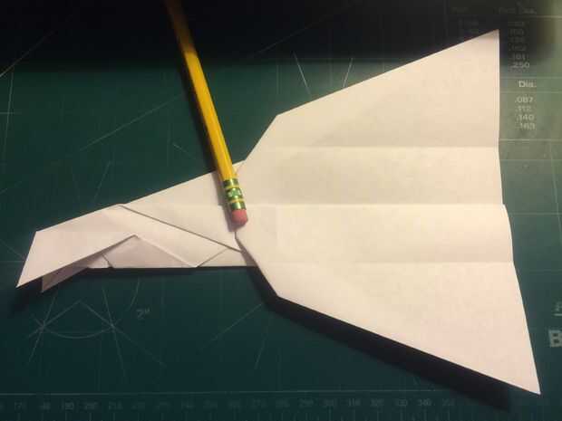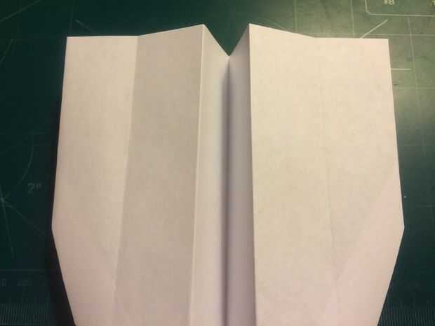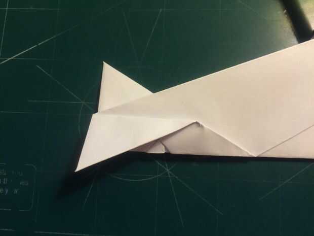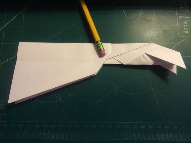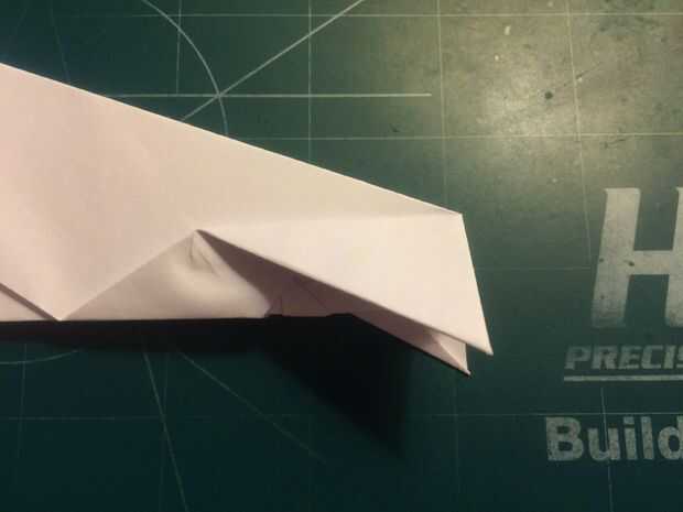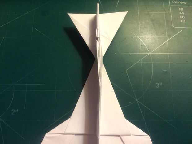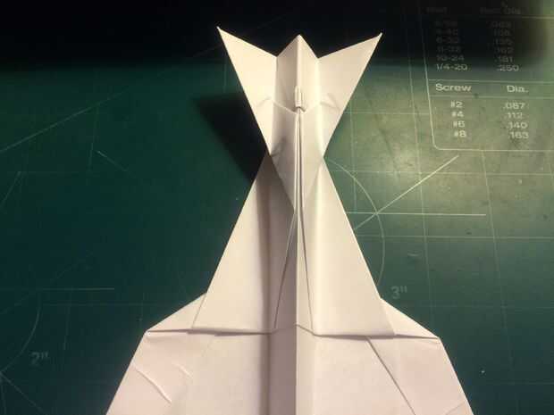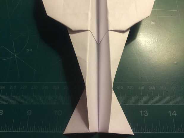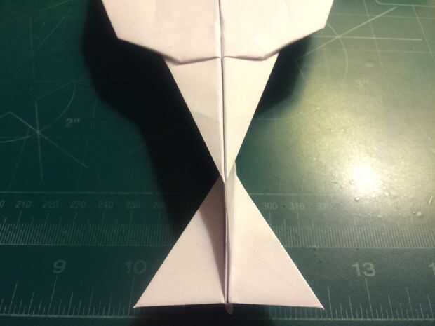 Doble hacia abajo las canards mientras mantienen sus bordes principales alineados con la nariz para mantener un ángulo de incidencia de cero grados. A continuación, plegar las alas en el cuarto pliegues que previamente. Alinee los bordes de fuga de las alas con eso del fuselaje para mantener el ángulo de incidencia a cero grados. Después de que esto termine, doblar los extremos del ala hasta los pliegues cuarto.