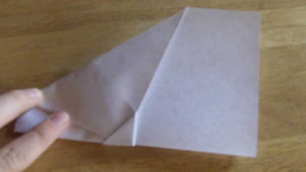 De la orientación anterior, doblar el avión a lo largo de su línea de centro. Entonces tire el borde hasta la parte inferior de la aeronave a lo largo de la línea central. Repita en el otro lado.