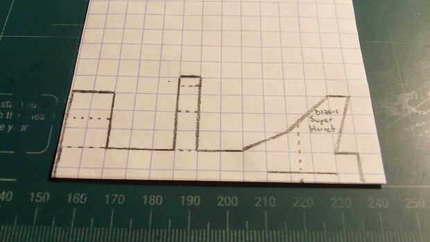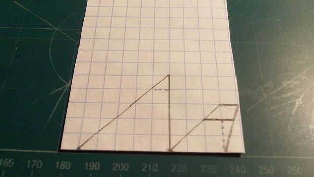 Una vez hecho esto, empezar a hacer las alas y el estabilizador horizontal. La construcción de las alas se debe comenzar por dibujar una línea con una pendiente (barrido) de 1:1. El acorde debe ser 5 cajas de largo en su centro y la envergadura debe ser total 10 cajas. Para hacer que el estabilizador horizontal, marcar 3 cajas que tienen al menos 1 caja de espacio libre detrás de ellos. La pendiente de la vanguardia debe ser 1:1 y el borde de fuga 1:3. Usted luego cortará la fila exterior de las cajas.