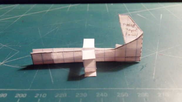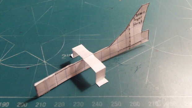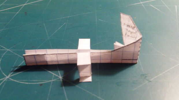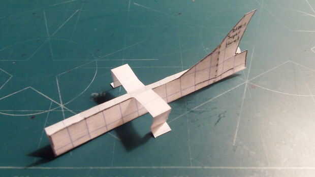 Doblar la sección trasera del fuselaje hacia adelante a lo largo de la línea punteada vertical que recorre verticalmente el timón de dirección. Una vez que has doblado lo, hacer un corte a lo largo de la línea media una caja desde la parte inferior del fuselaje. Una vez que hayas hecho este corte, se despliegan el timón. Luego tape la aeronave en su frente, largueros, contrapeso y enfrente el timón.