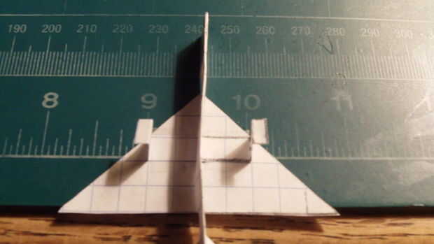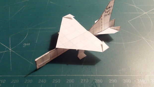 Despliegan sus alas y su fuselaje invertido del tirón. Cinta el ala al fuselaje mediante la aplicación de cinta a los largueros, con la proyección de la apropiación del ala. Una vez terminado, doble las puntas exteriores a lo largo de las líneas punteadas y aplicar una grapa en el área de contrapeso. El Super Hornet está ahora listo para el vuelo.