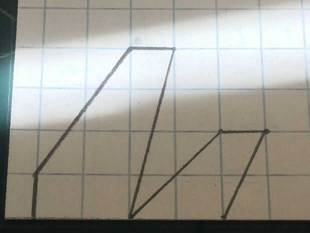 Después de que el fuselaje se hace, tomar otra hoja de papel que se dobla por la mitad a lo largo de las líneas de cajas. Marcar el ala como se muestra (2 cajas de acorde a la raíz, por 5 cajas de ancho, con un movimiento de vanguardia de 2 cajas de acorde eliminaron cada 3 cajas de la raíz del fuselaje y un borde posterior barrido de 1 caja de acorde cada 4 cajas de la raíz). Luego cortar el ala. Medir 2 cajas a lo largo del pliegue, medir dos cajas hacia arriba de una marca y hacer otro punto. Luego trace una línea diagonal conectar esta nueva marca a la que más lejos. De la marca que acaba de realizar, medir una caja más lejos de la ahora conectado a la línea y haga una marca. Esboce una línea entre esta marca y la otra marca a lo largo del pliegue. Luego corte los estabilizadores horizontales.