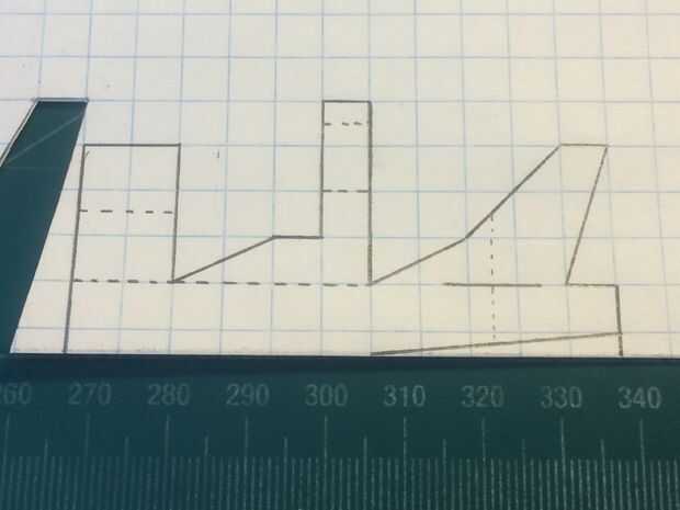 En primer lugar, comenzar por plegamiento eres tu papel milimetrado en la mitad (excepto tres cajas en el lado perforado). Una vez que el papel ha sido doblado adecuadamente, haga dos marcas--11 cajas full apart. Use una regla para hacer una línea recta con una longitud de 11 cajas directamente a 1 fila de cajas de las dos marcas que acaba de hacer. Luego realizar el timón y contrapeso como se indica. Siga las marcas de la fotografía. Luego, marque los largueros de ala y patines. Una caja hacia delante del borde posterior del estabilizador vertical, hacer una línea horizontal continua 2 cajas de longitud como se muestra (más adelante esto se convertirá en la ranura a través del cual pasan los estabilizadores horizontales). También, dibujar la línea diagonal en la parte inferior del fuselaje.