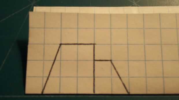 Después de que el fuselaje se hace, tomar otra hoja de papel que se dobla por la mitad a lo largo de las líneas de cajas. Marcar el ala como se muestra (2 cajas de longitud por 3 cajas de ancho y una porción barrida frente a este cuadro de 1 caja eliminaron cada 3 cajas de fuselaje). Adicionalmente, la medida 2 cajas a lo largo del pliegue y 2 cajas arriba de un lado y hacia adelante el 1 cuadro. Luego trace una línea diagonal que conecta esta línea el otro borde de la línea a lo largo del pliegue. Esto hará que los estabilizadores horizontales. Luego recórtalo.