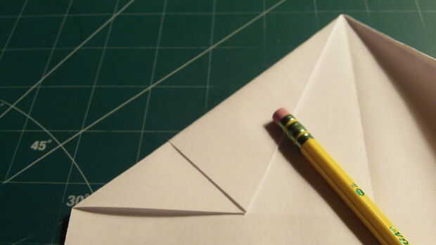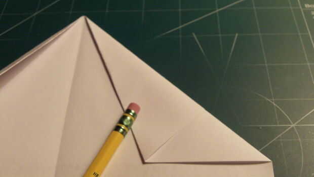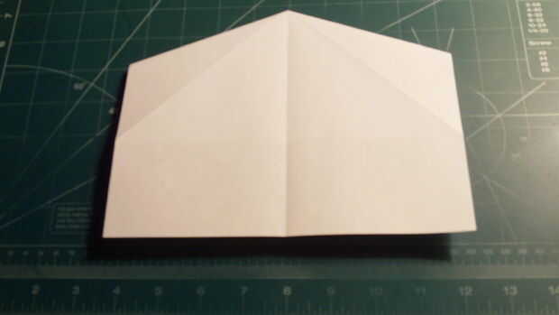 Voltee su papel en el lado "limpio". Entonces baje los bordes delanteros a lo largo de la tapa restante líneas de pliegue. Una vez hecho esto, doblar su avión en mitad a lo largo de su centro con el lado que usted ha estado trabajando en el exterior.
