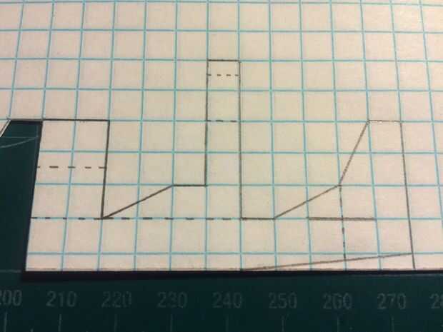 En primer lugar, comenzar por plegamiento eres tu papel milimetrado en la mitad (excepto tres cajas en el lado perforado). Una vez que el papel ha sido doblado adecuadamente, haga dos marcas--11 cajas full apart. Use una regla para hacer una línea recta con una longitud de 10 cajas directamente a 1 fila de cajas de las dos marcas que acaba de hacer. Luego realizar el timón y contrapeso como se indica. Siga las marcas de la fotografía. Luego, marque los largueros de ala y tren de aterrizaje. Por detrás, mida 1 caja hacia adelante y haga una línea sólida larga 2 cajas. Medir 1 caja de principio de línea horizontal y marcar una línea vertical punteada. Una vez que todo está marcado hacia fuera, cortar el fuselaje. A lo largo de la parte inferior del fuselaje, medir 4 cajas de la parte posterior. En la parte posterior, medir cajas de 0,5 por encima de la parte inferior del fuselaje. Haga una línea diagonal que conecta estas dos marcas.