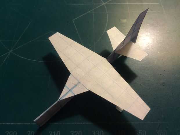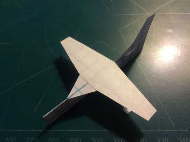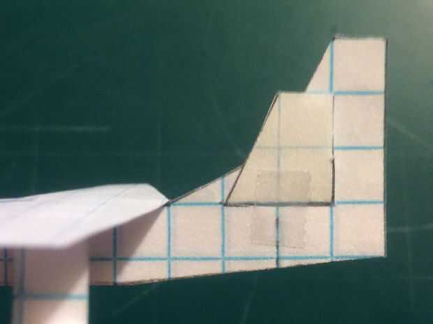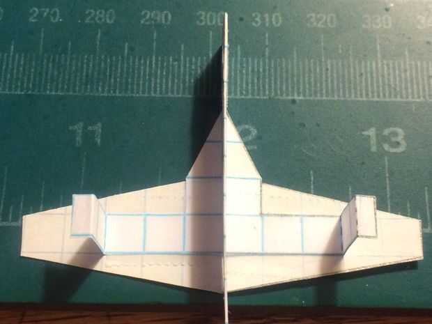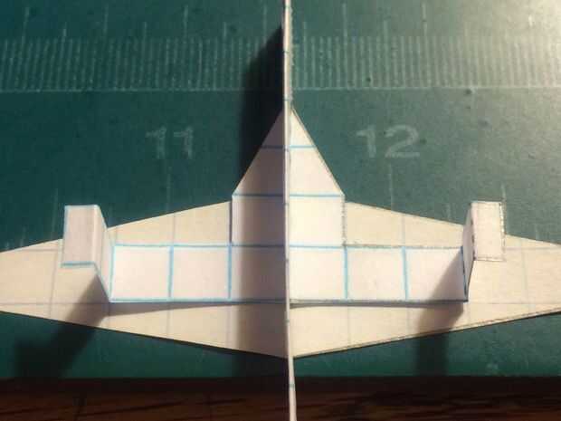 Cortar tus alas y pone hacia fuera plana. Alinee el fuselaje sobre la parte superior para que los largueros se alineen con el ala como se muestra. Luego aplique la cinta. Corte cualquier exceso. Voltee el avión y aplicar cinta en el borde de ataque del ala por encima de las extensiones de la raíz de vanguardia. Una vez que ha terminado con las alas, cortar sus estabilizadores horizontales y deslícelos a través de la abertura en el fuselaje que formuló. Cuando a través, doble hacia arriba y aplique la cinta en la parte inferior; luego doble hacia abajo. Luego aplicar una grapa en la zona del contrapeso. Esto habrá completado su avión.