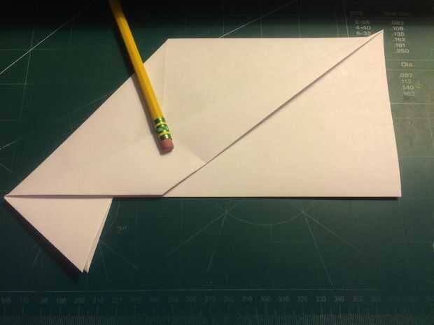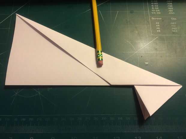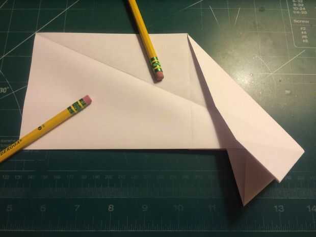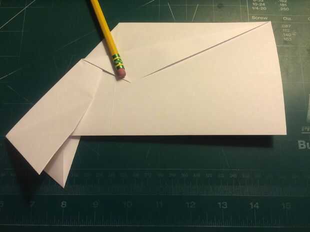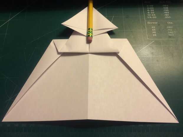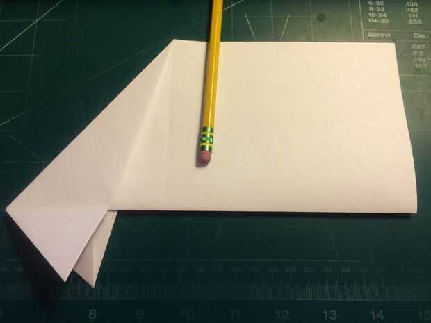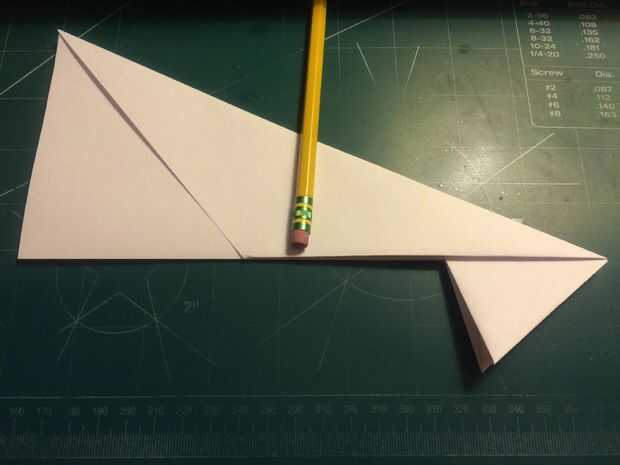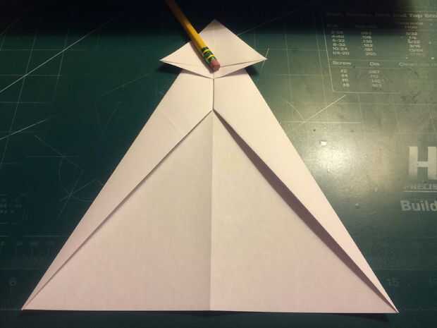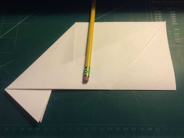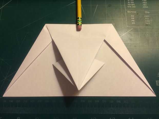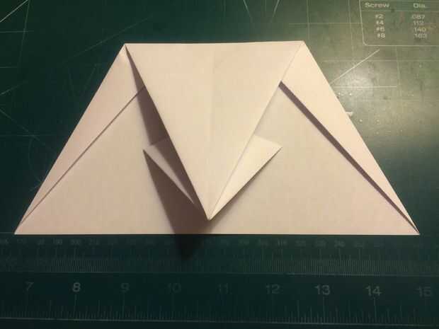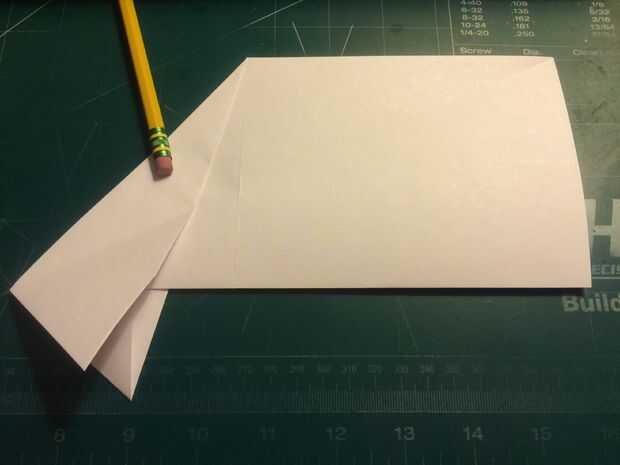 Con los Perfiles doblados, tire de la punta de la nariz hacia el borde de fuga y pliegue una vez que alcanza este punto. Tirar de la nariz hacia adelante otra vez a lo largo de la anchura la mitad doble y restaurar ese pliegue. Tire de los extremos de este pliegue hacia adentro como se muestra.