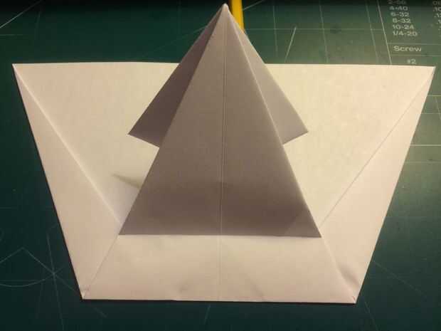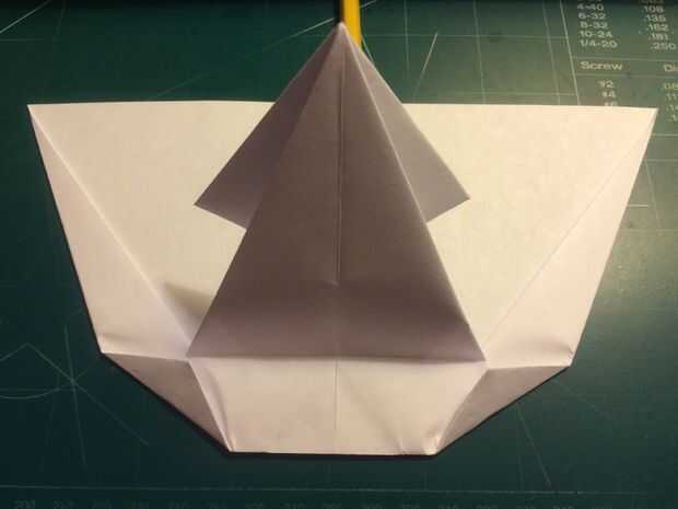 Empezar tirando de los bordes delanteros hasta el pliegue de centro cada lado. Después de hacer esto, despliegan y tire de los bordes exteriores en a los pliegues como resultado de los dos primeros dobleces del paso y doblar a lo largo de los dos pliegues para completar los perfiles.