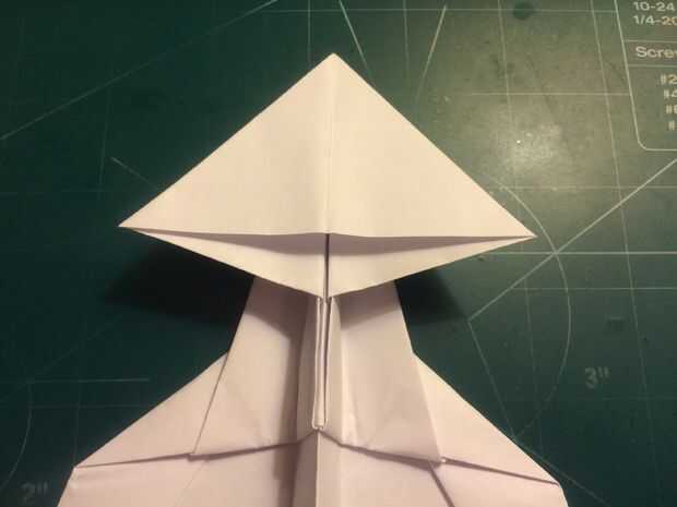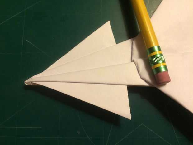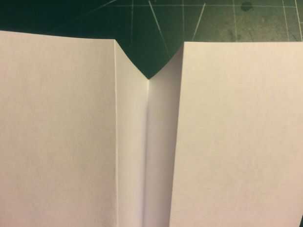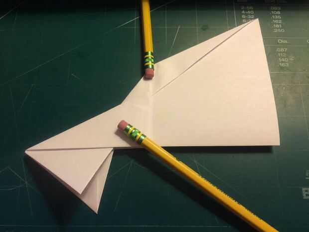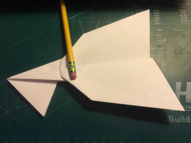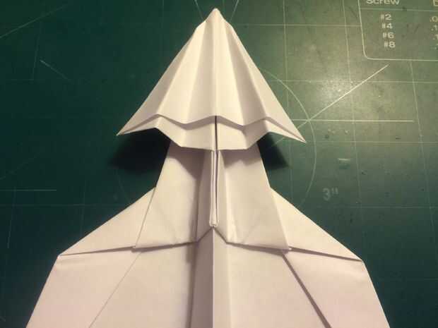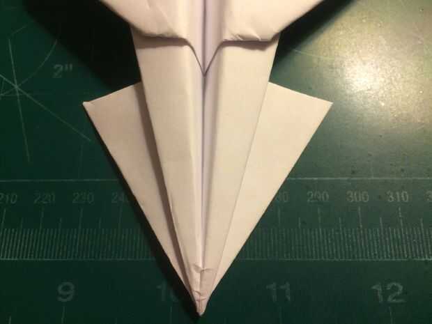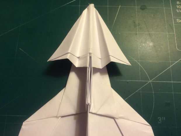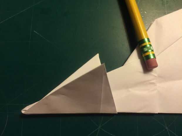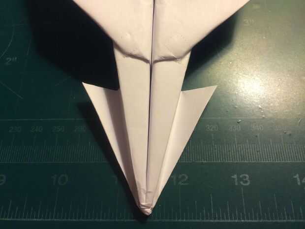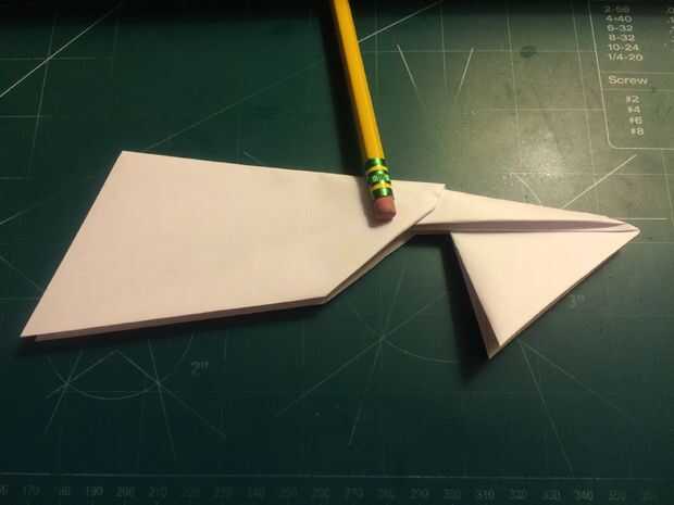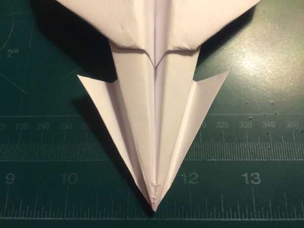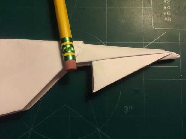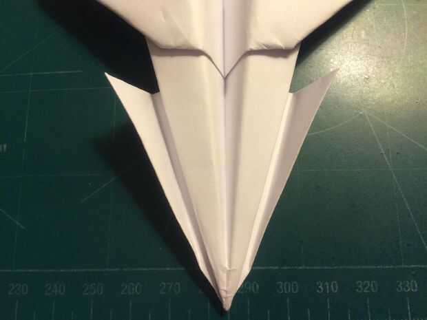 Doblar las alas alineando los bordes delanteros de las extensiones de la raíz de vanguardia con el pliegue de centro del fuselaje como se muestra en cada lado. El avión del doblez por la mitad y los estabilizadores hasta así. Restaurar los pliegues de las alas y los estabilizadores con las alas del doblez como se muestra. Una vez que los estabilizadores han sido arrugadas con las alas, doblarlas hacia arriba y alrededor de las extensiones de la raíz de vanguardia como se muestra. (Trate de hacer esto tan limpio como sea posible, la tolerancia del diseño es tal que lo puede acomodar alguna asimetría, pero menos allí es más fácil manejar el avión.)