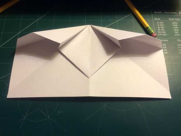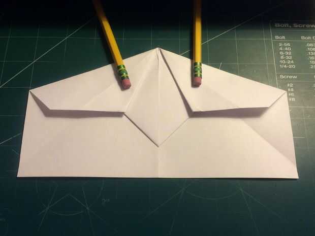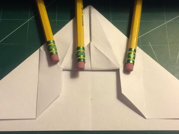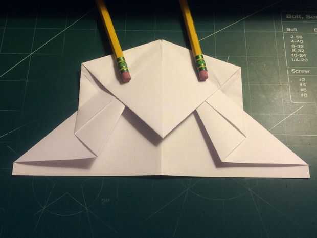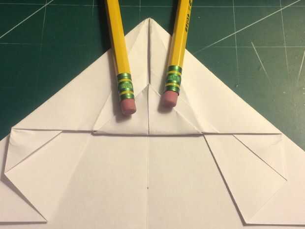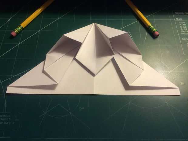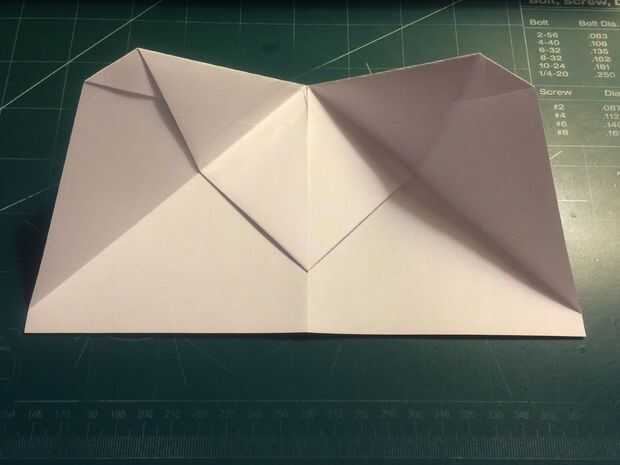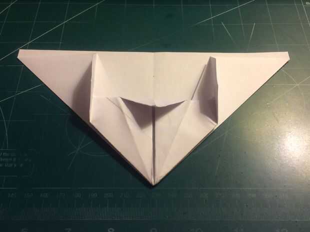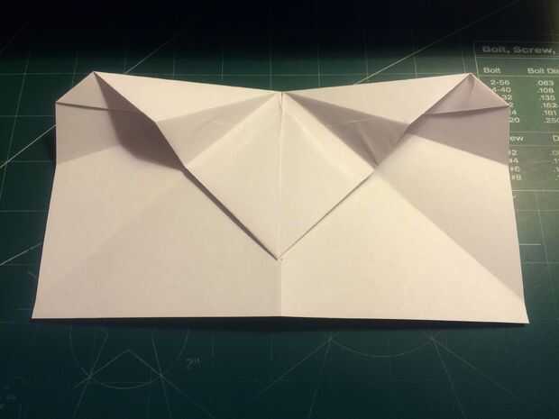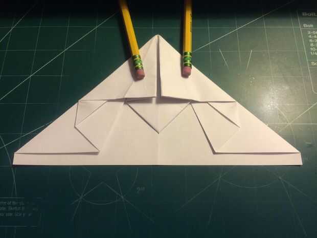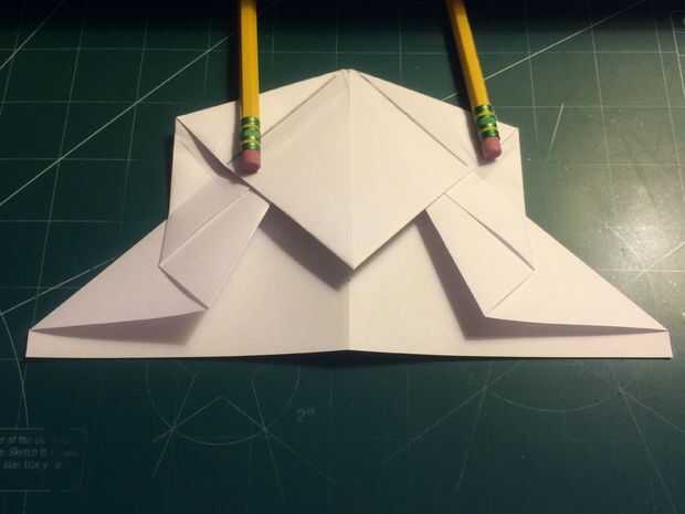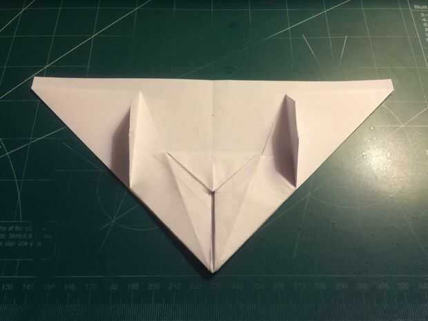 Después de estas bolsas han sido tiradas en posición, tire el triángulo de papel detrás de ellos adelante y encima de ellos. Con eso hecho, tire de las aletas perder de interior de papel hasta que se alcanza el límite del papel en los extremos de la parte posterior de estas aletas (Asegúrese de que usted haga no rasgar el papel) y los bordes traseros de la perpendiculares de los últimos pliegues de superficie de sustentación se alinearán uno con el otro como se muestra. Esto asegurará que estos estabilizadores verticales estén alineados con el pliegue de centro del avión.