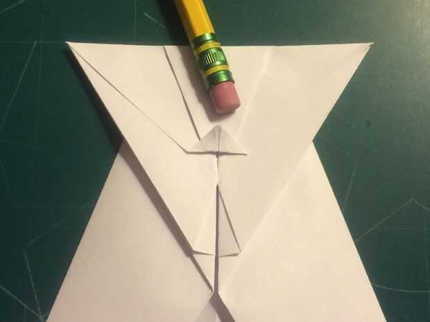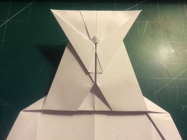 Doblar los pliegues anteriores a lo largo de los pliegues existentes como se muestra, luego tire del papel saliente detrás del pliegue del centro. Repita en el otro lado. Tire de la punta de la nariz hacia atrás hasta que sus puntas cubrir el ápice del diamante; luego doble los bordes del papel debajo de las otras capas como se muestra. Tire de las puntas del papel a lo largo de los bordes de fuga en el pliegue del centro y el pliegue. Después de completar esto, despliegue y voltear el papel y tire el borde romo de la nariz hasta el borde de fuga. Después de hacer esto, vuelva a tirar la nariz hacia adelante hasta que los pliegues de la nariz sobre la superficie de sustentación posterior los bordes y el pliegue. Desplegar la nariz y plegar los bordes de los pliegues anteriores como se muestra, luego tire la nariz vuelta hacia adelante sobre estos pliegues una vez más.