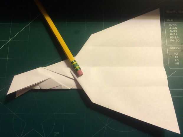 Doble hacia abajo las canards mientras mantienen sus bordes principales alineados con la nariz para mantener un ángulo de incidencia de cero grados. A continuación, plegar las alas en el cuarto pliegues que previamente. Alinee los bordes de fuga de las alas con eso del fuselaje para mantener el ángulo de incidencia a cero grados. Después de que esto termine, doblar los extremos del ala hasta los pliegues cuarto.